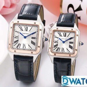 CARTIER SANTOS FOR COUPLE REPLICA WATCHES TWO TONE BLACK LEATHER STRAP 27.5 – 45.5MM