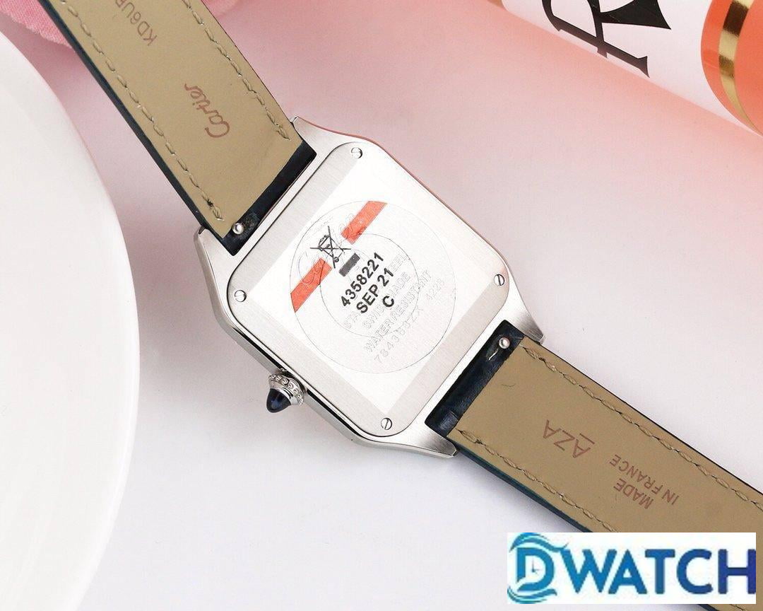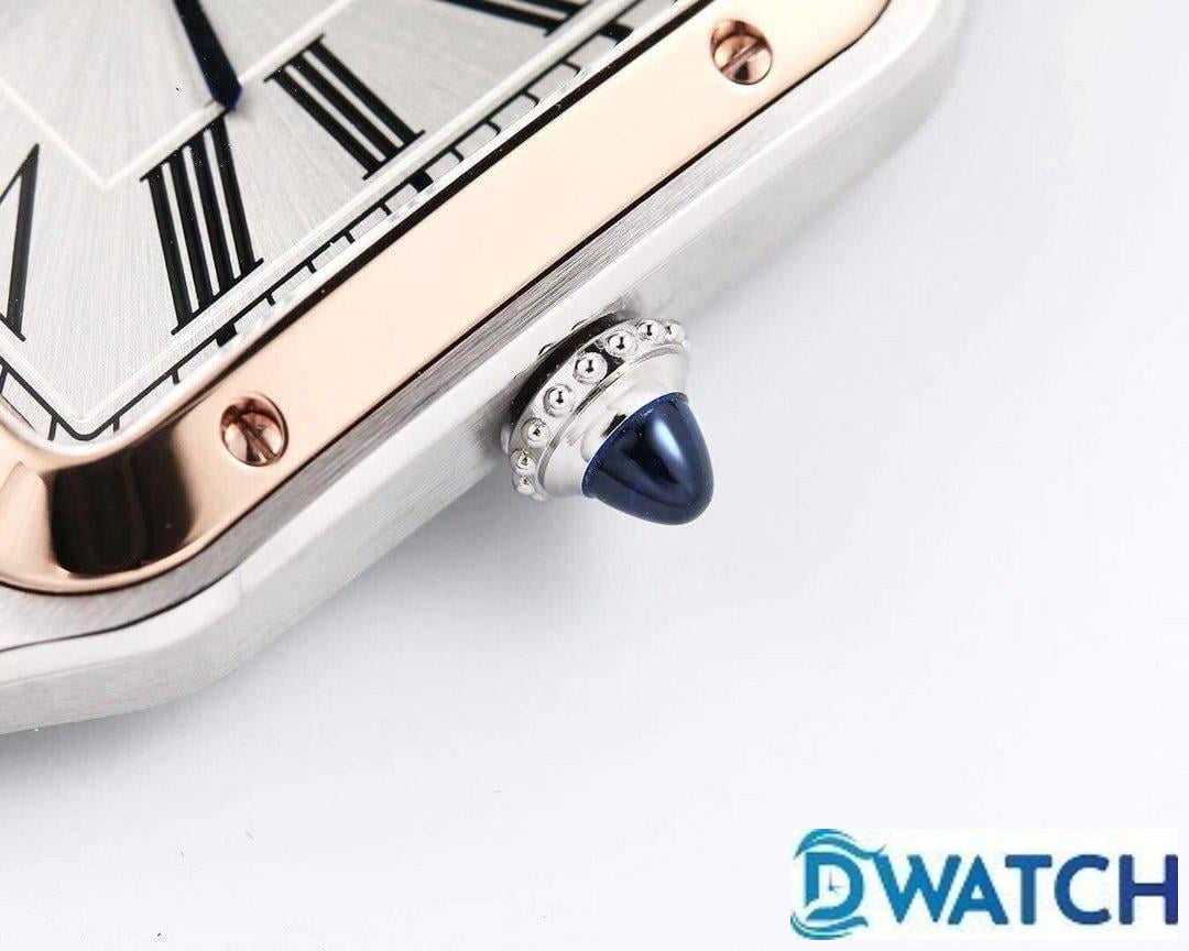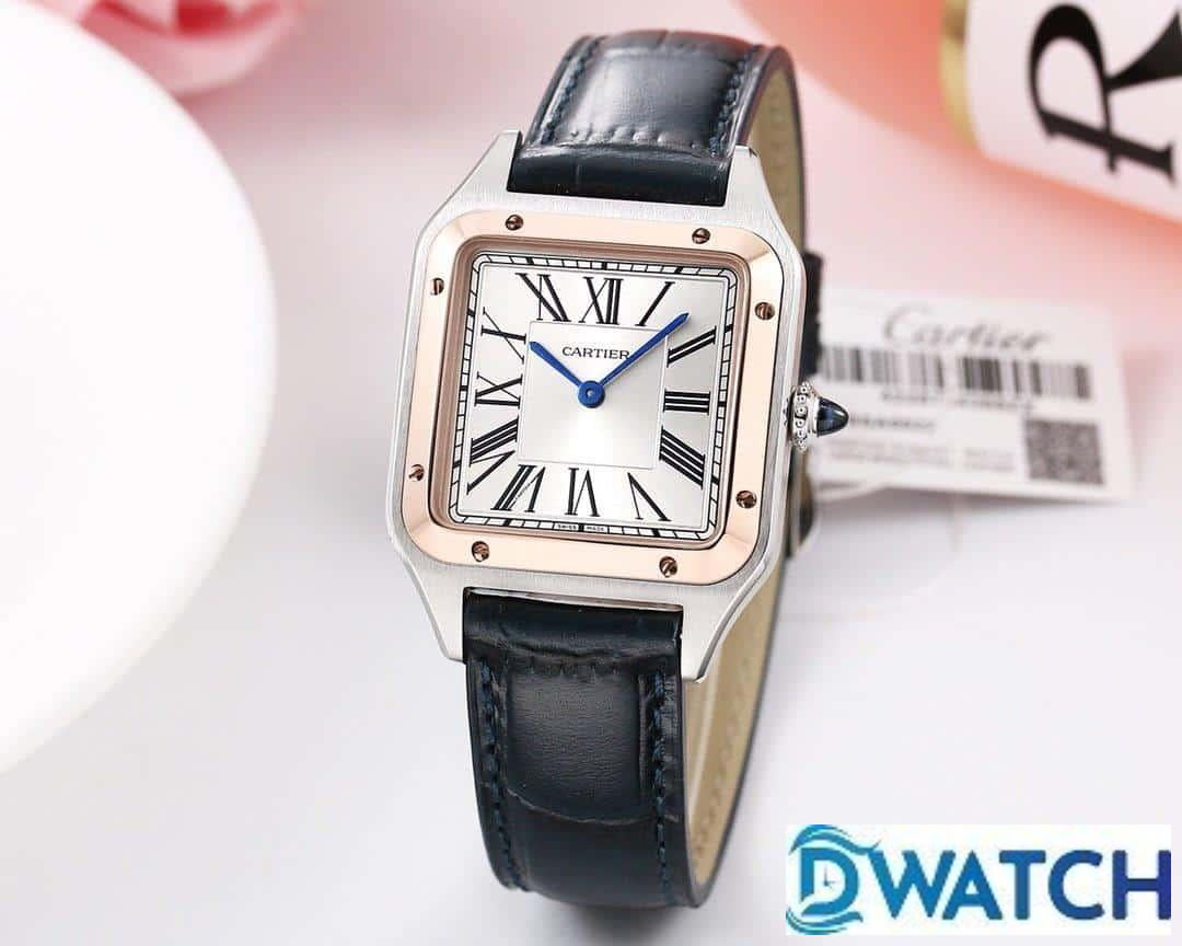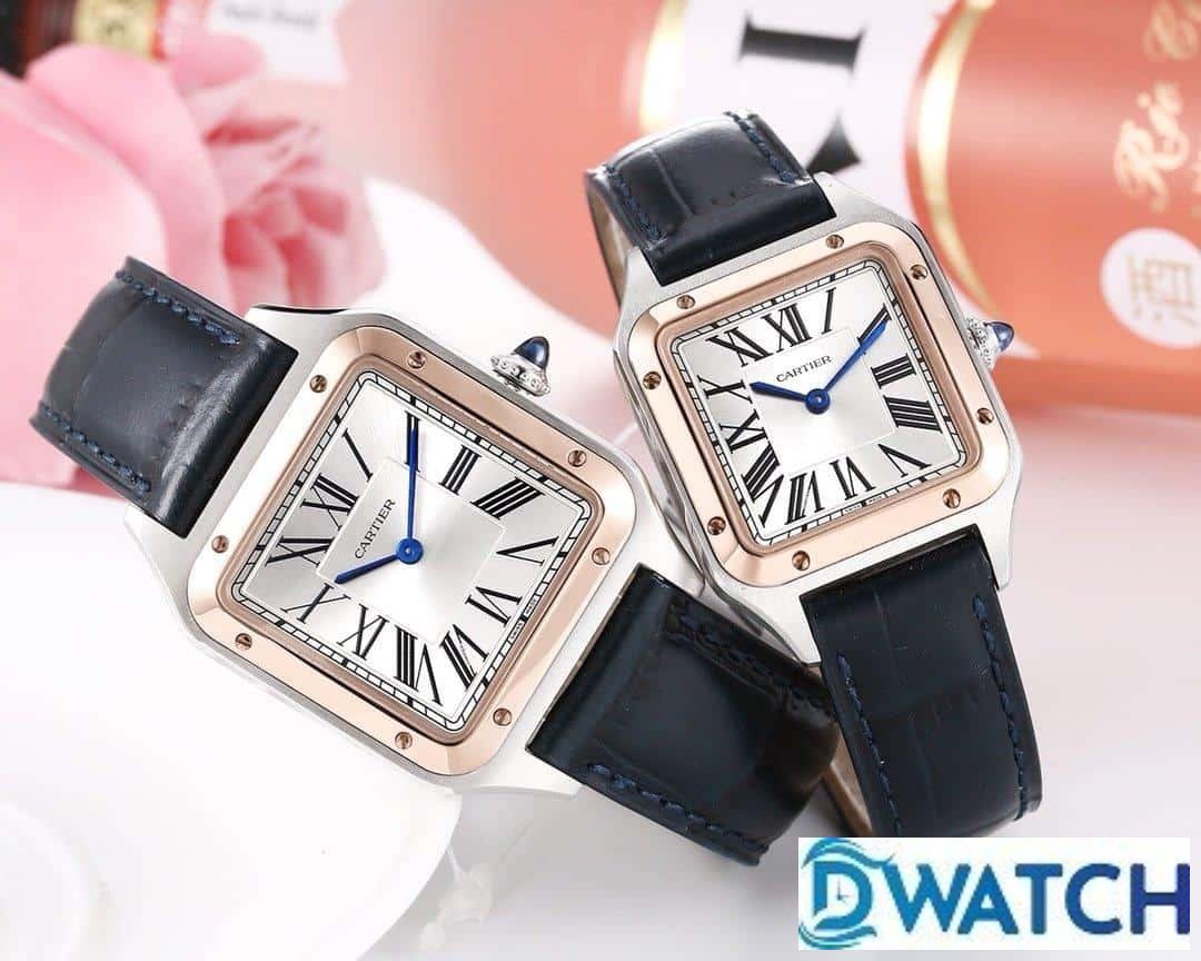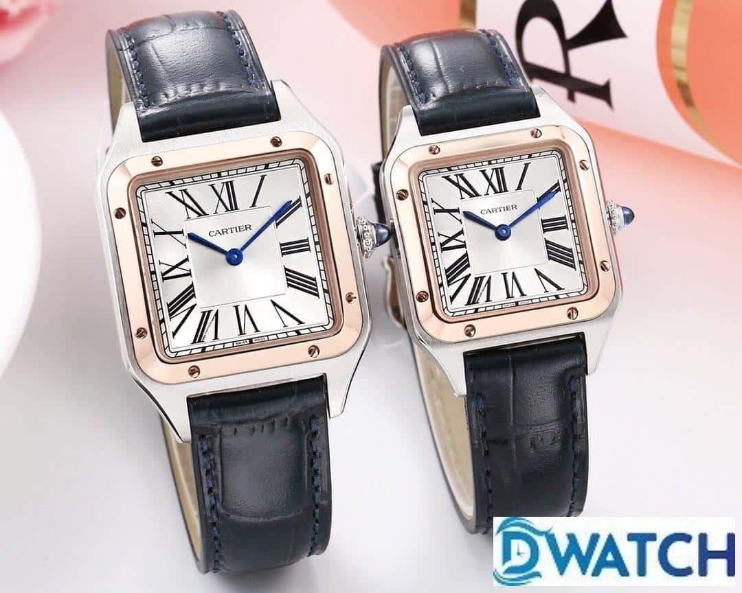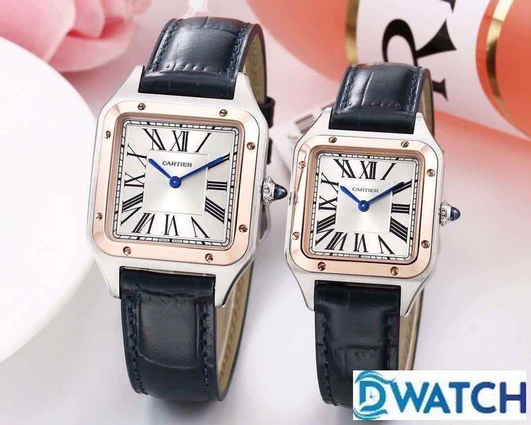 CARTIER SANTOS FOR COUPLE REPLICA WATCHES TWO TONE BLACK LEATHER STRAP 27.5 – 45.5MM