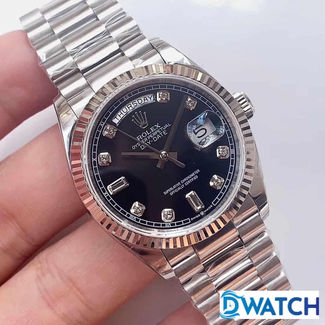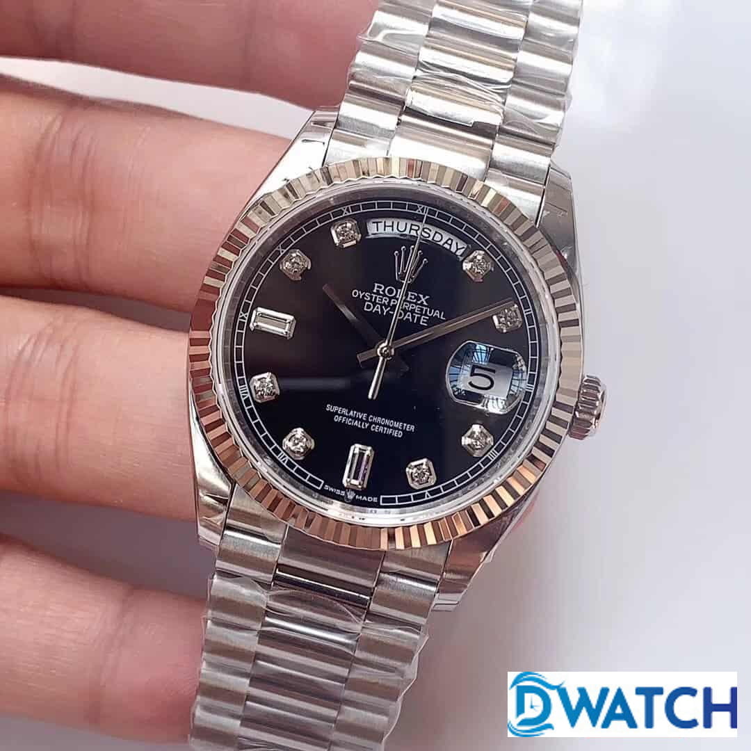 ĐỒNG HỒ NAM ROLEX DAY-DATE DÂY KIM LOẠI MẶT MÀU ĐEN REPLICA 36MM