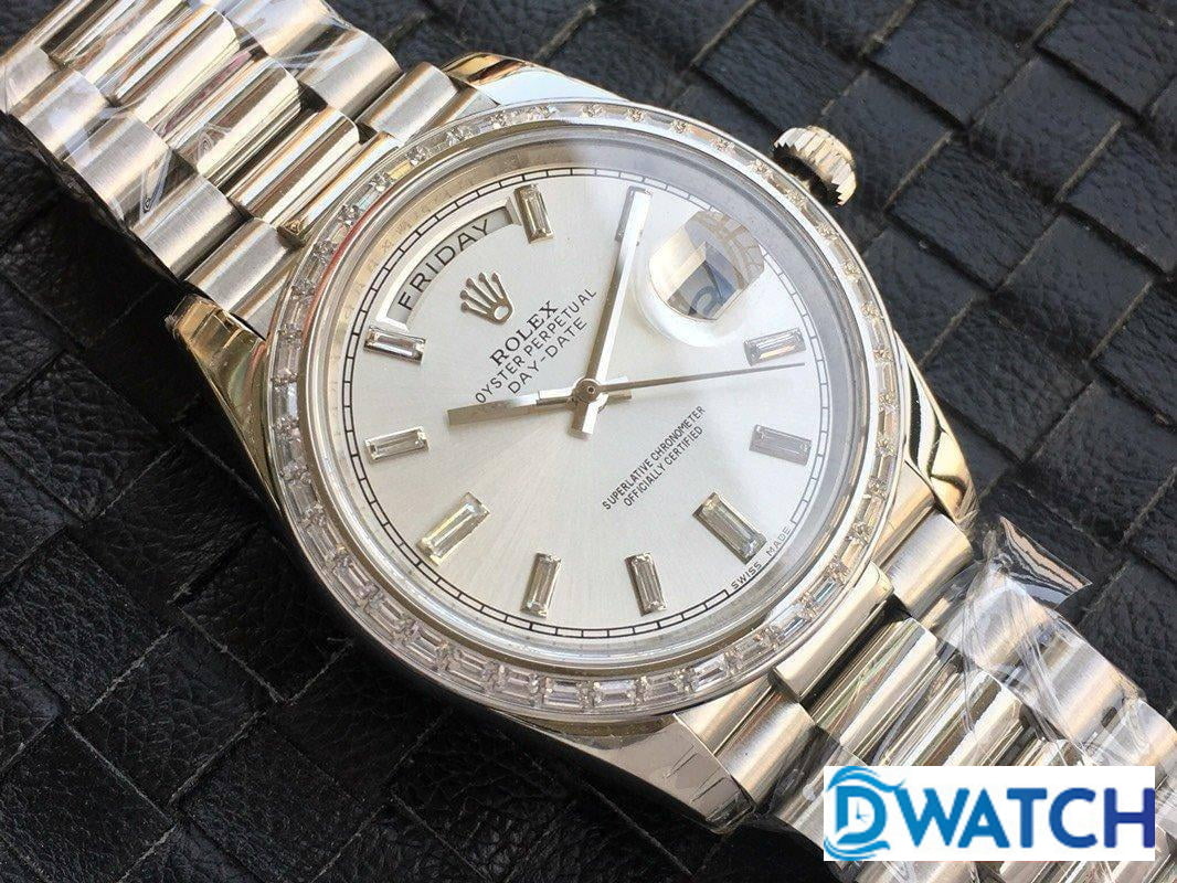 ĐỒNG HỒ NAM ROLEX DAY-DATE MÁY CƠ DÂY KIM LOẠI ĐÍNH ĐÁ MẶT MÀU TRẮNG REP 1:1 40MM