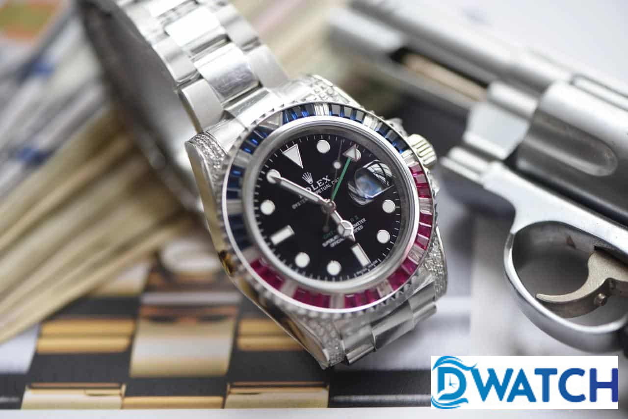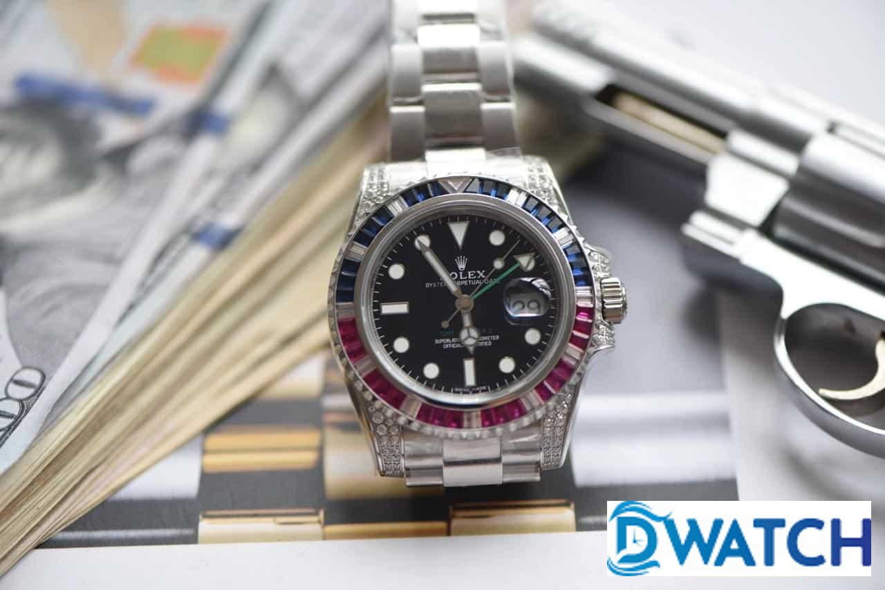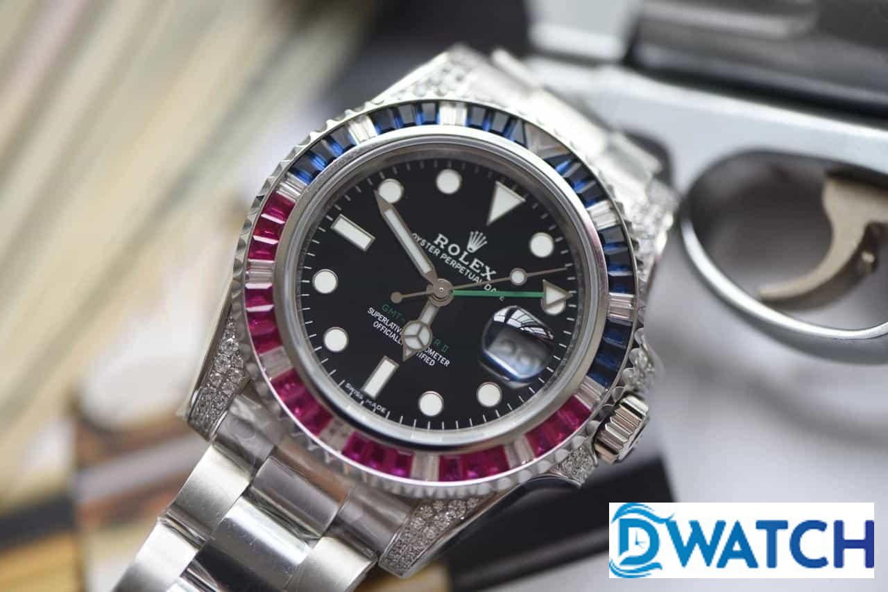 ĐỒNG HỒ NAM ROLEX GMT-MASTER ll MÁY CƠ ĐÍNH ĐÁ DÂY KIM LOẠI REPLICA 40MM