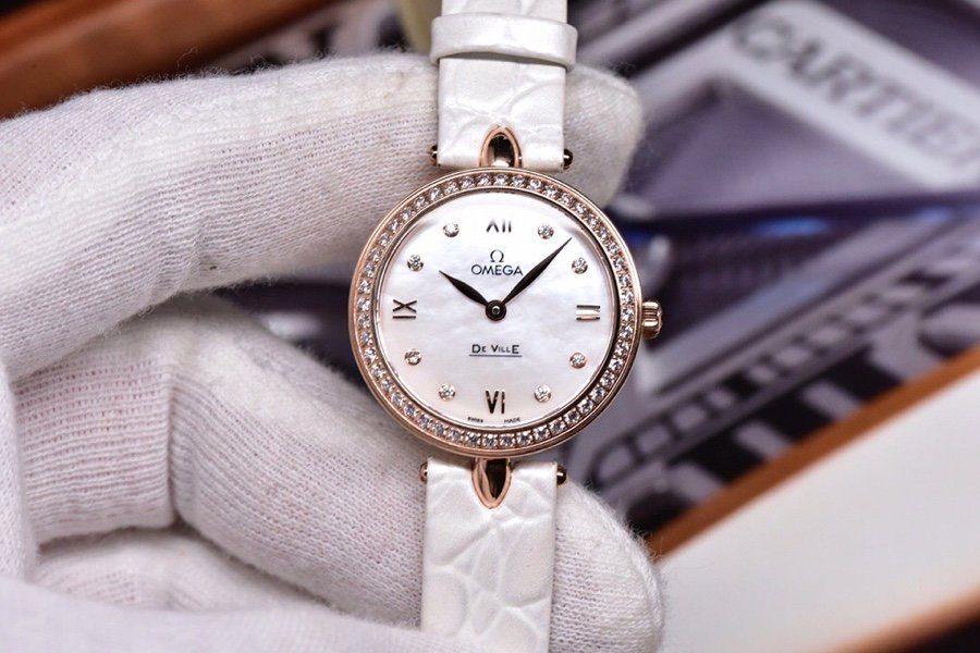 ĐỒNG HỒ NỮ OMEGA DE VILLE FAKE CAO CẤP NHÀ MÁY 3S DÂY DA TRẮNG 27MM