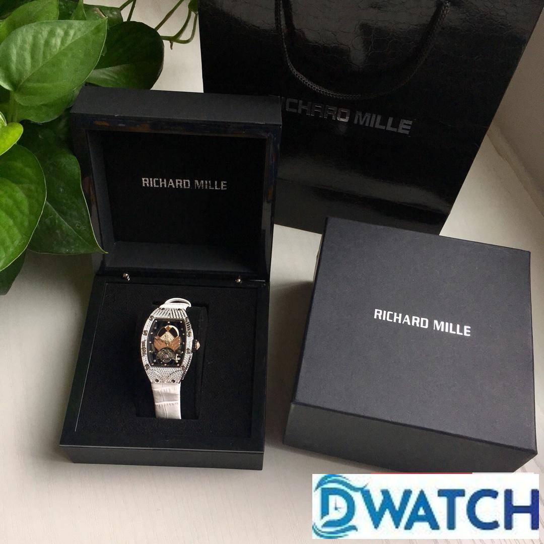 ĐỒNG HỒ NỮ RICHARD MILLE RM71-01 FAKE CAO CẤP ĐÍNH ĐÁ DÂY DA TRẮNG 34MM