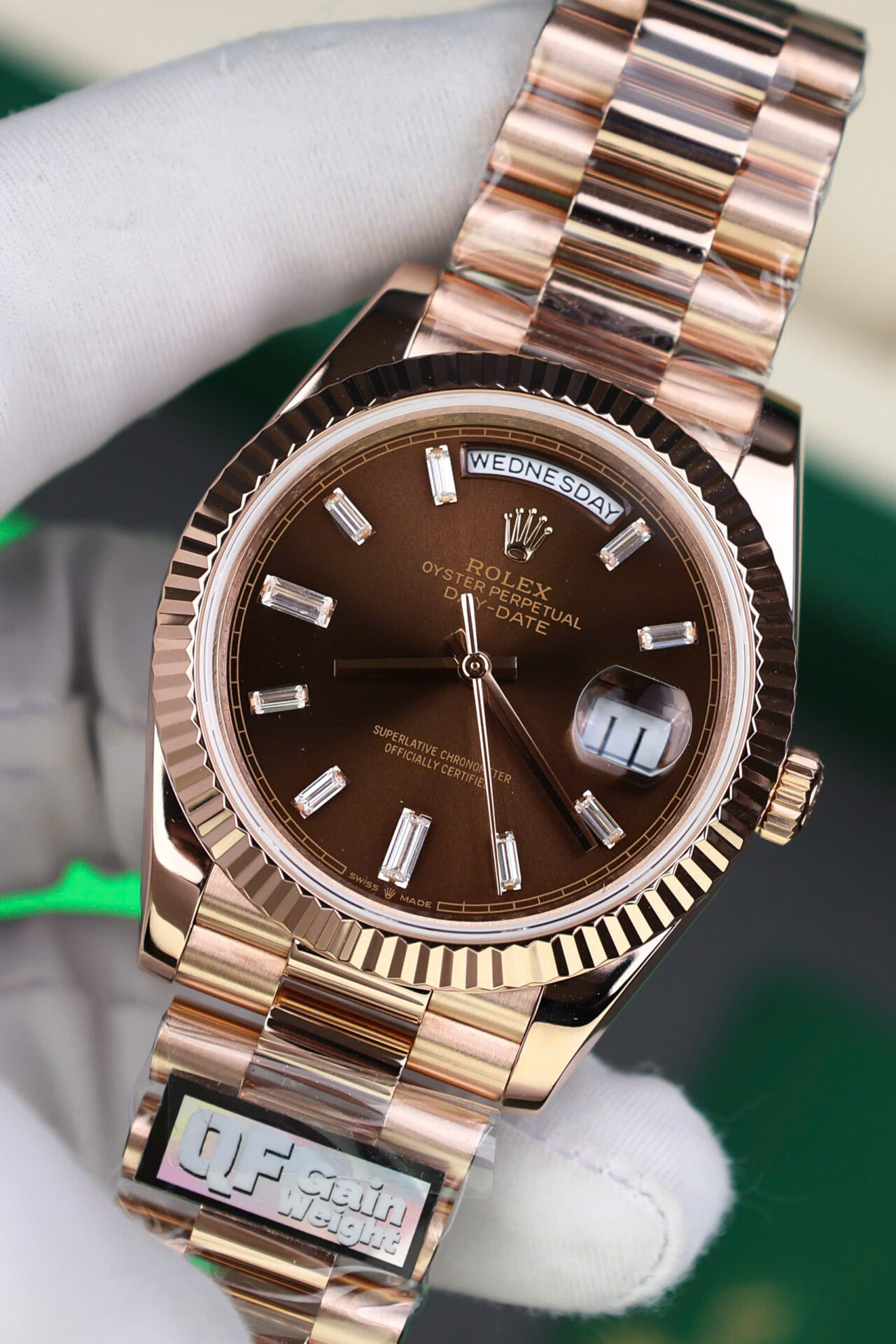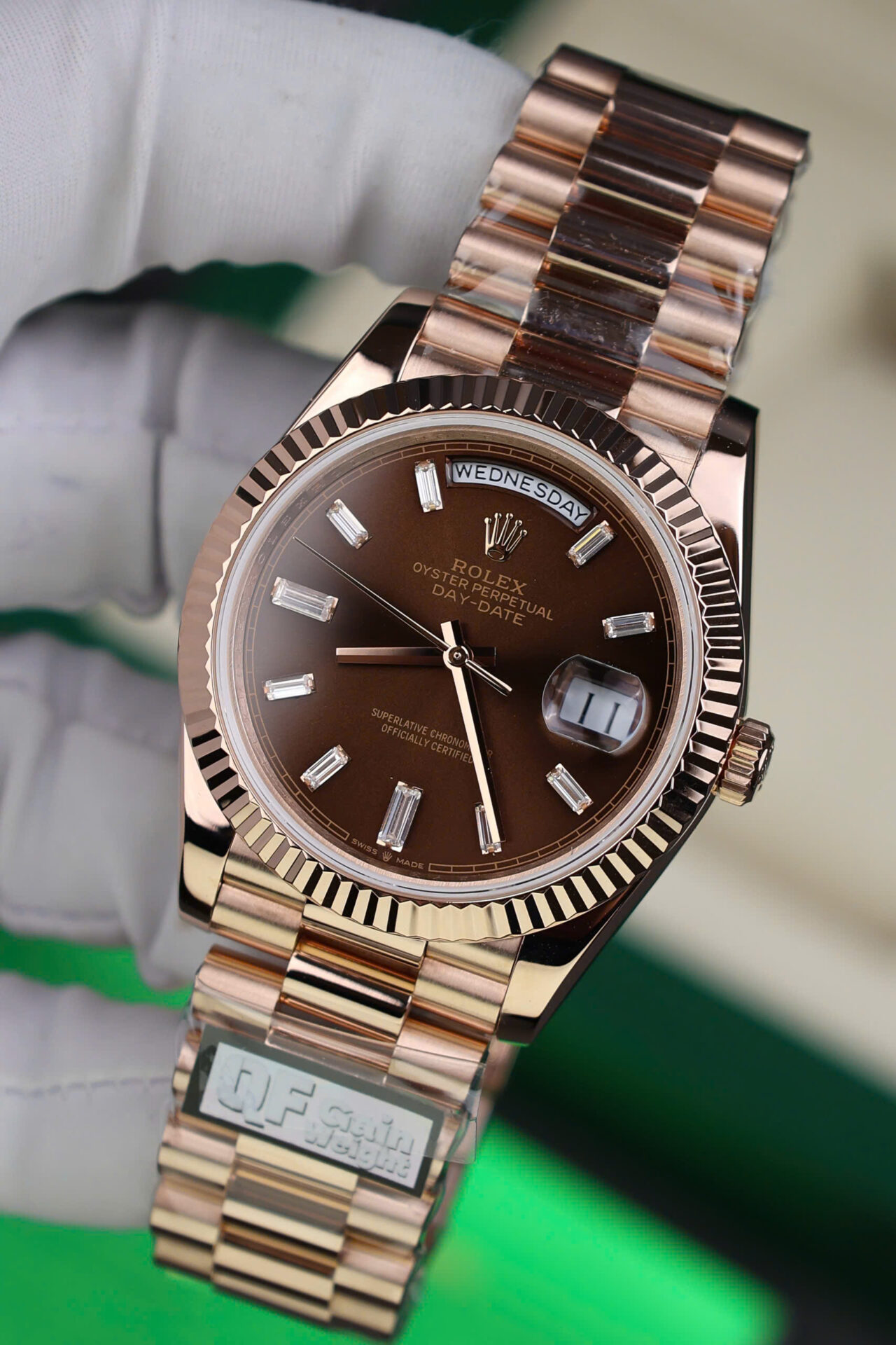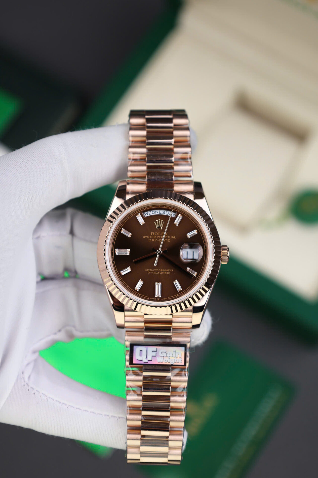 ĐỒNG HỒ ROLEX DAY-DATE CHẾ TÁC BỌC VÀNG HỒNG CỌC BAGUETTE NHÀ MÁY QF 40MM