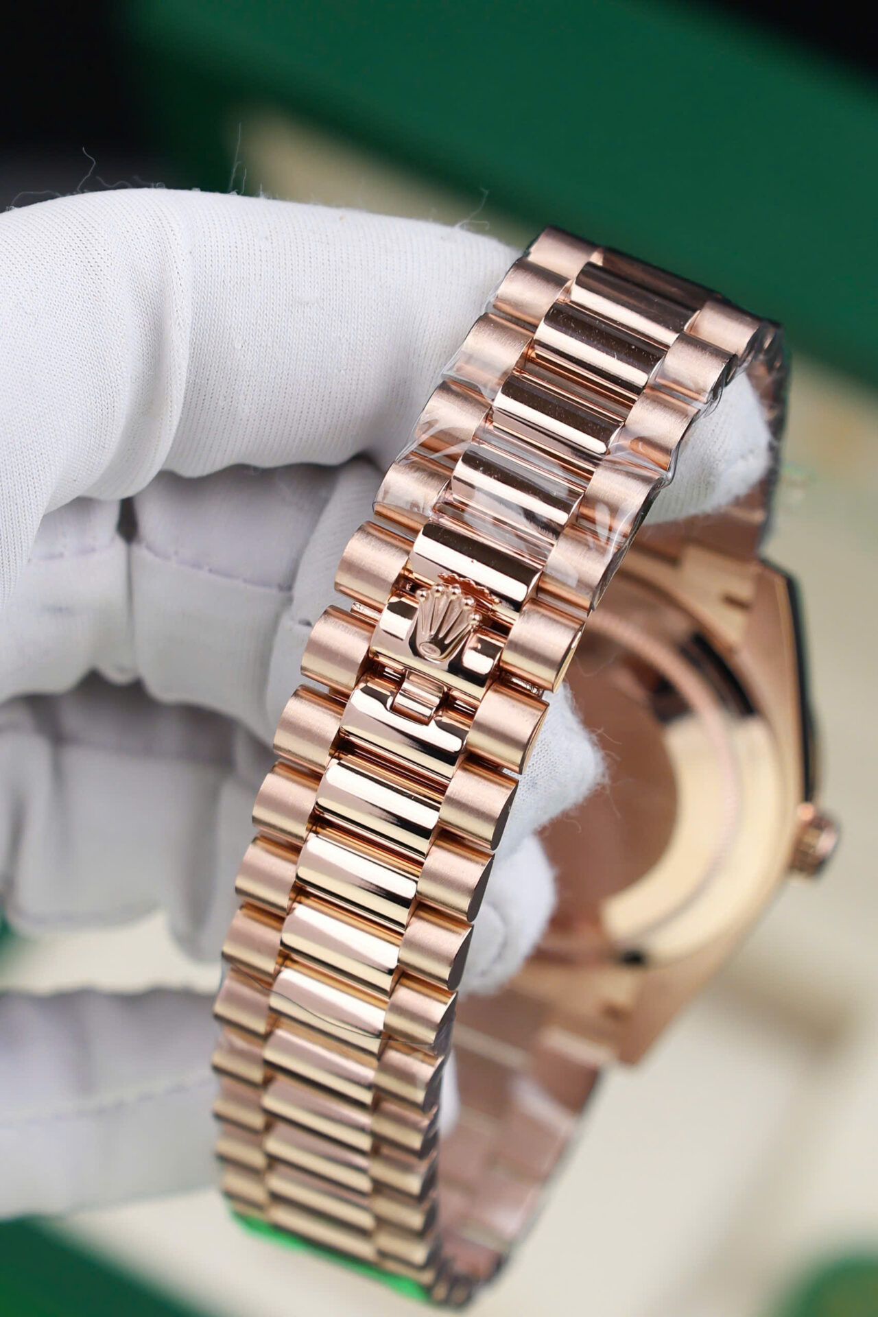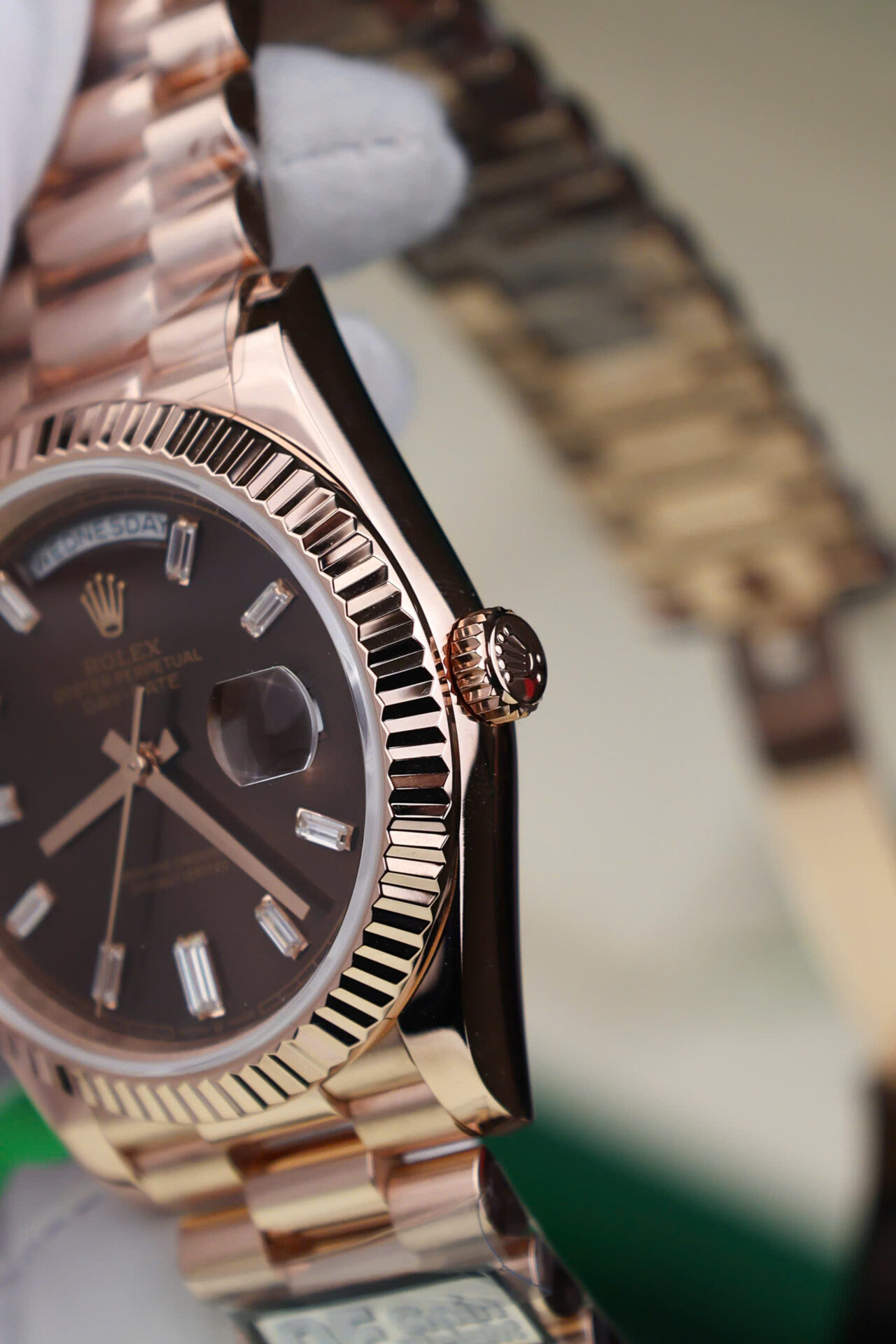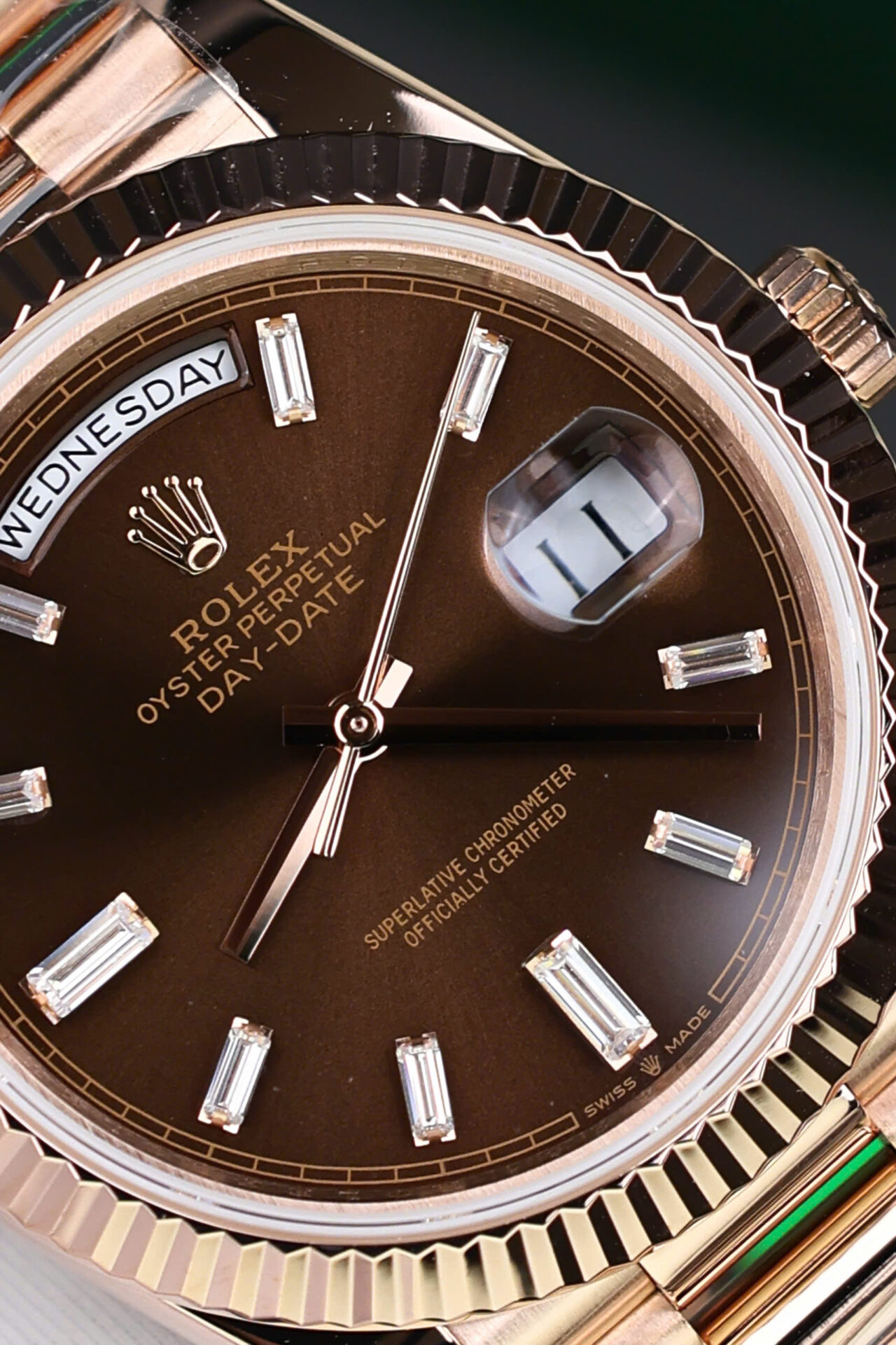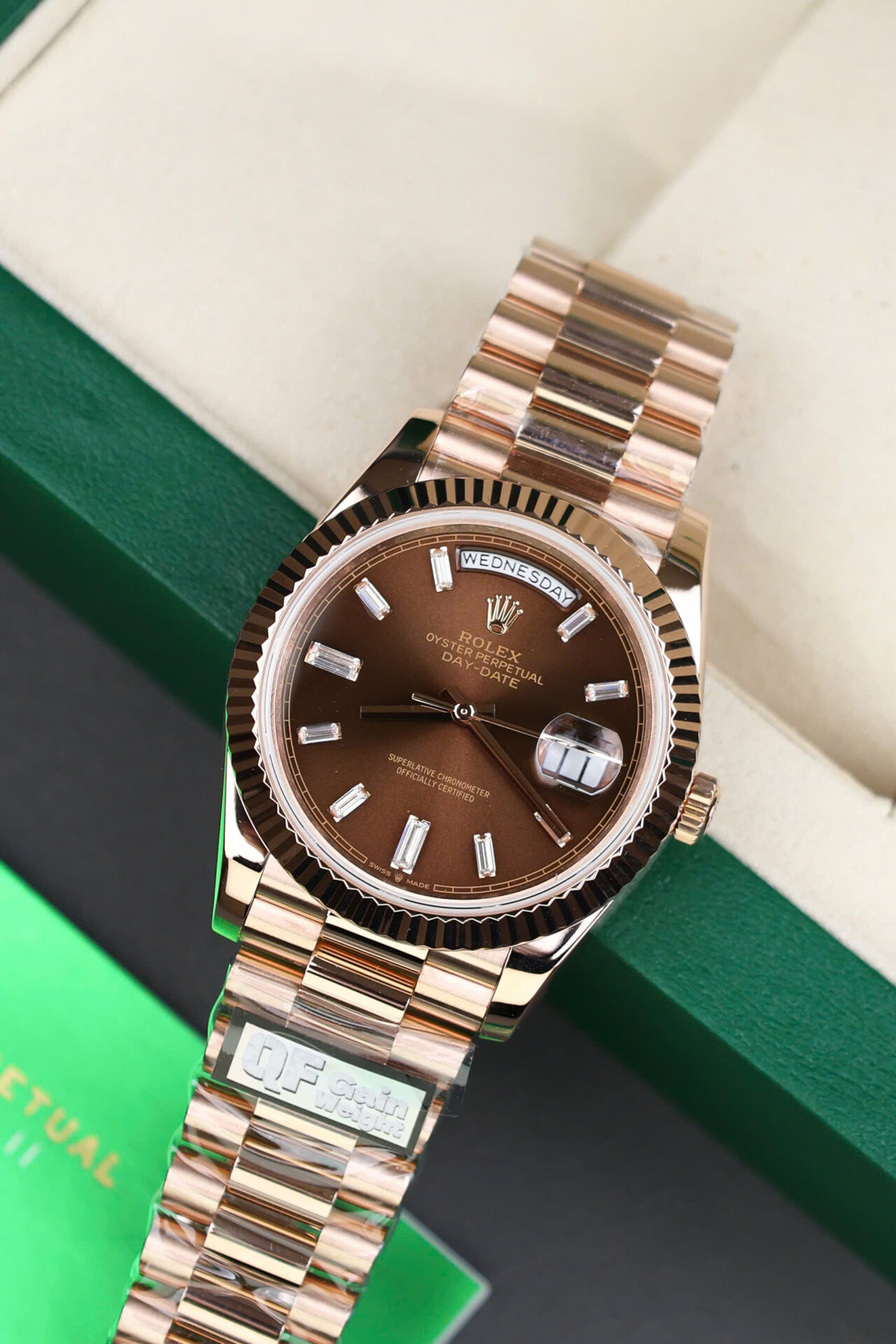 ĐỒNG HỒ ROLEX DAY-DATE CHẾ TÁC BỌC VÀNG HỒNG CỌC BAGUETTE NHÀ MÁY QF 40MM