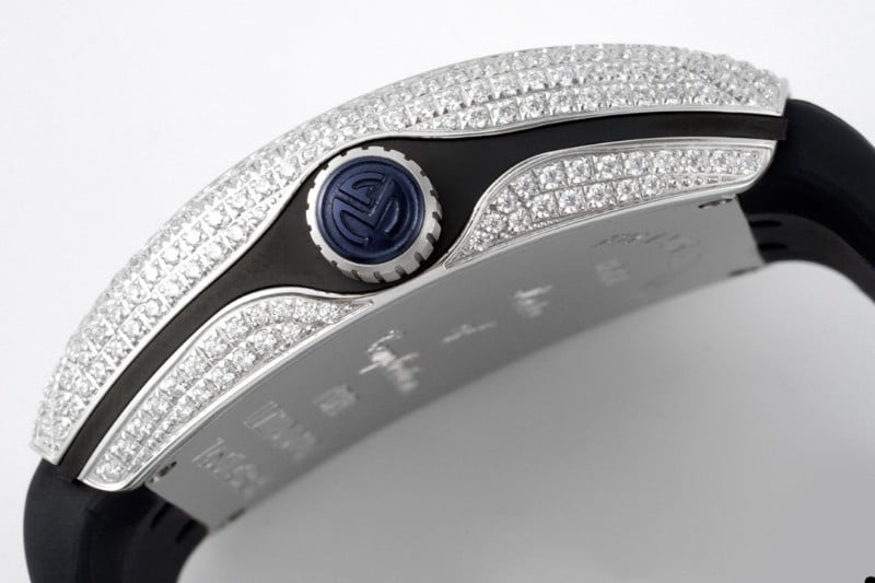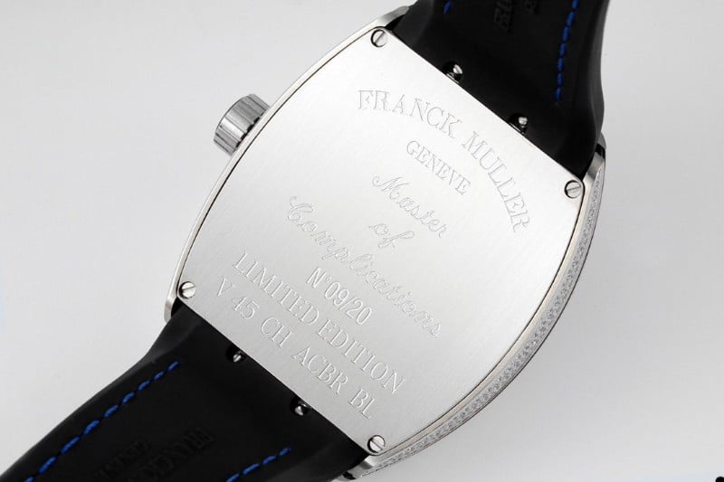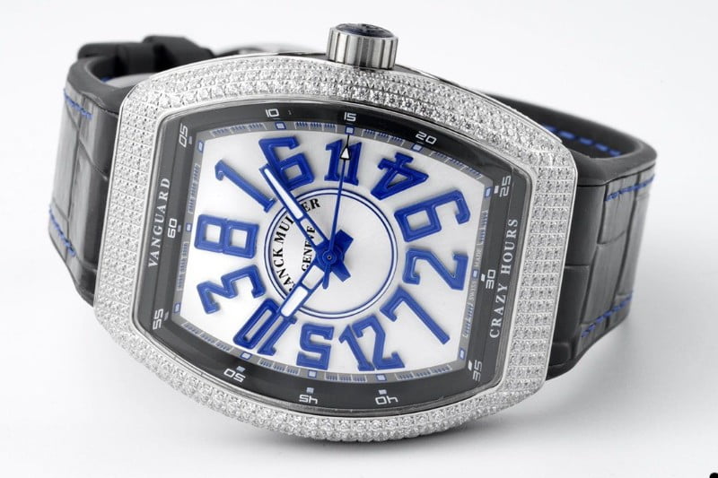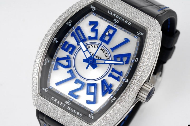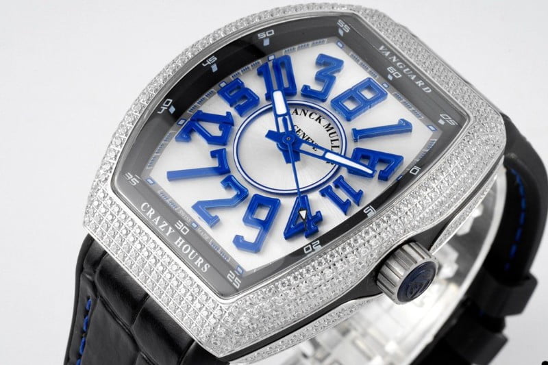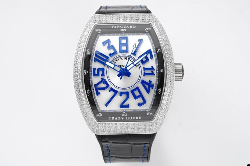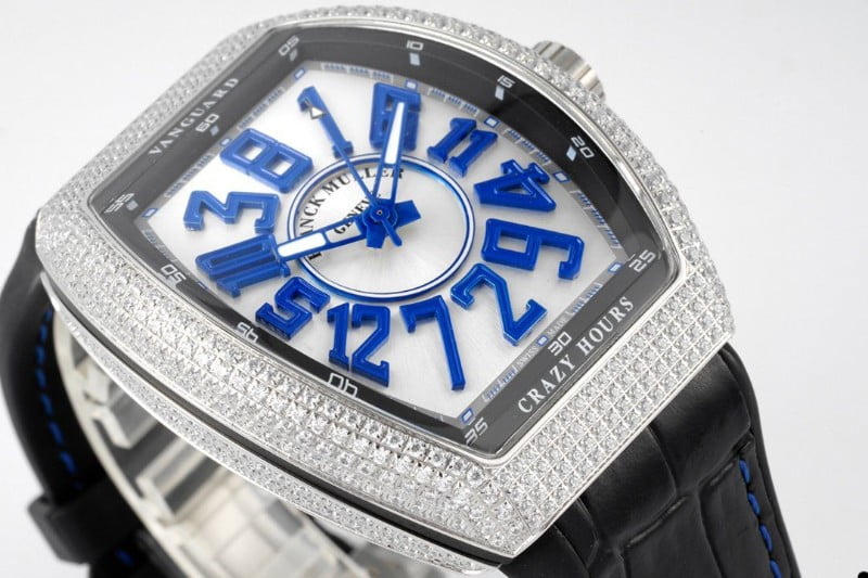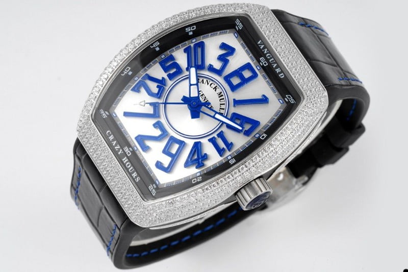 FRANCK MULLER VANGUARD V45 CRAZY HOURS REPLICA WATCHES RHINESTONE CASE BLUE HOURS 44MM