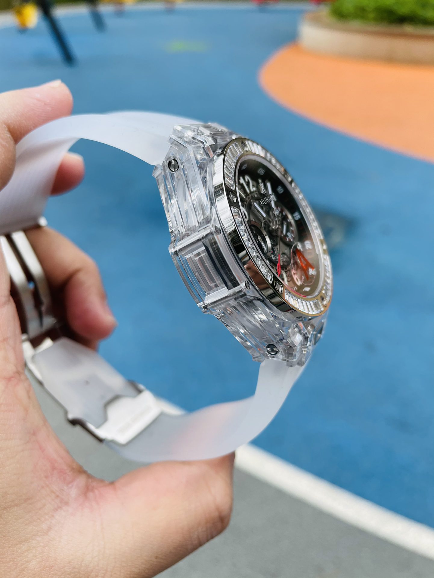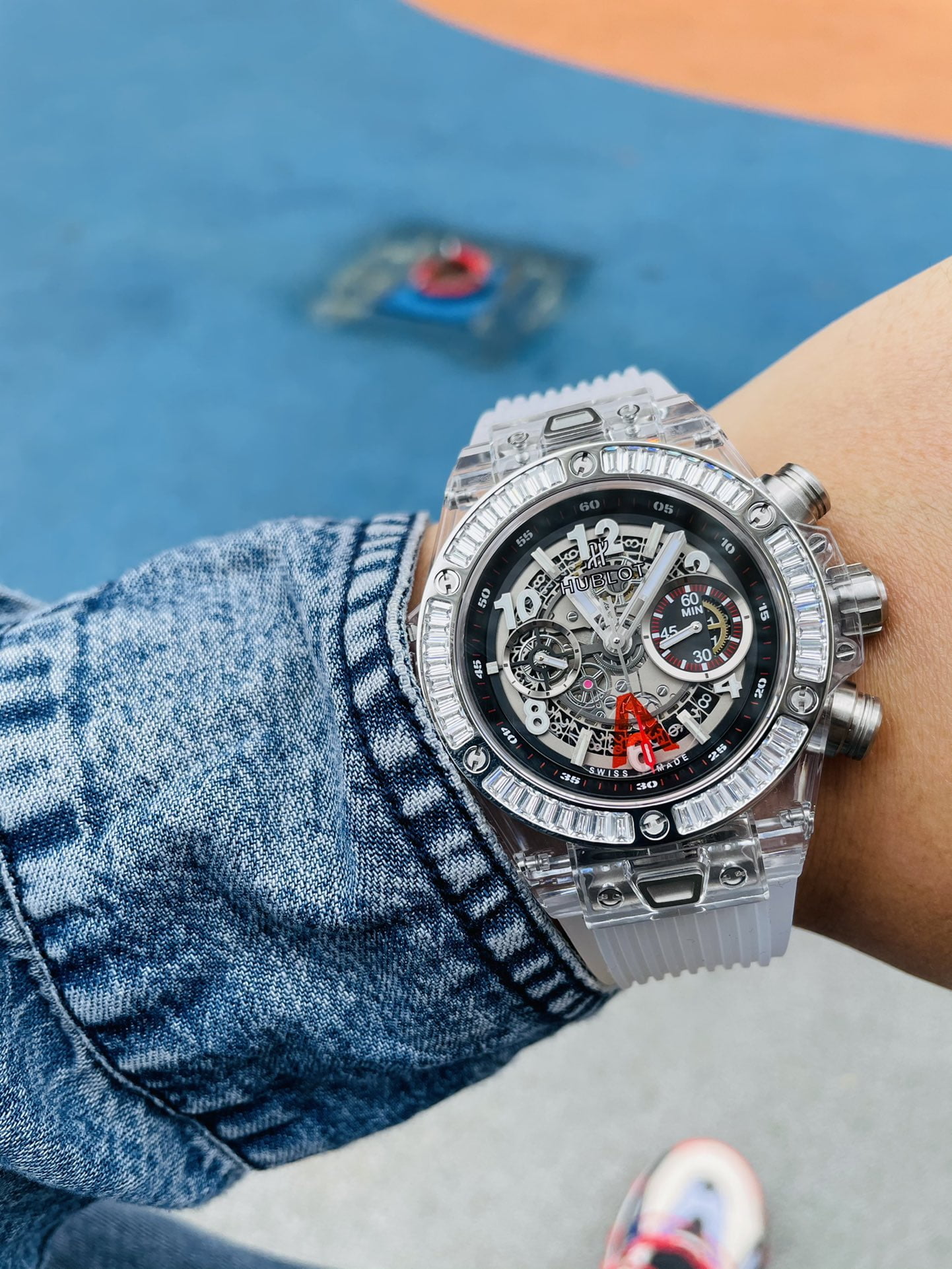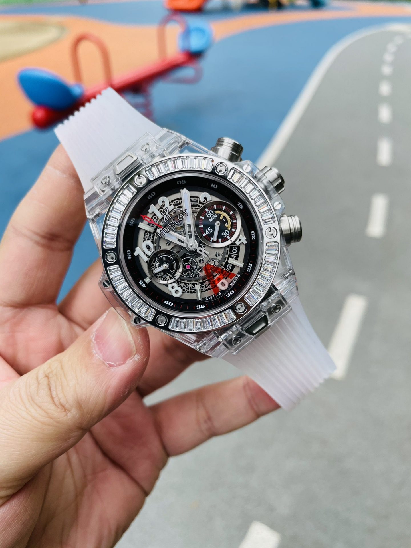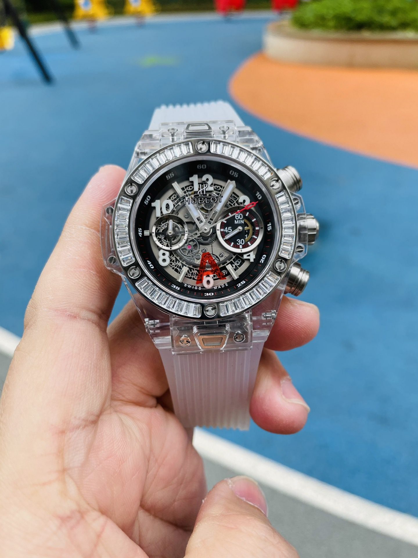 HUBLOT BIG BANG UNICO CHRONOGRAPH BEST REPLICA WATCHES CRYSTAL CASE RHINESTONE BEZEL BAGUETTE HB FACTORY 45MM