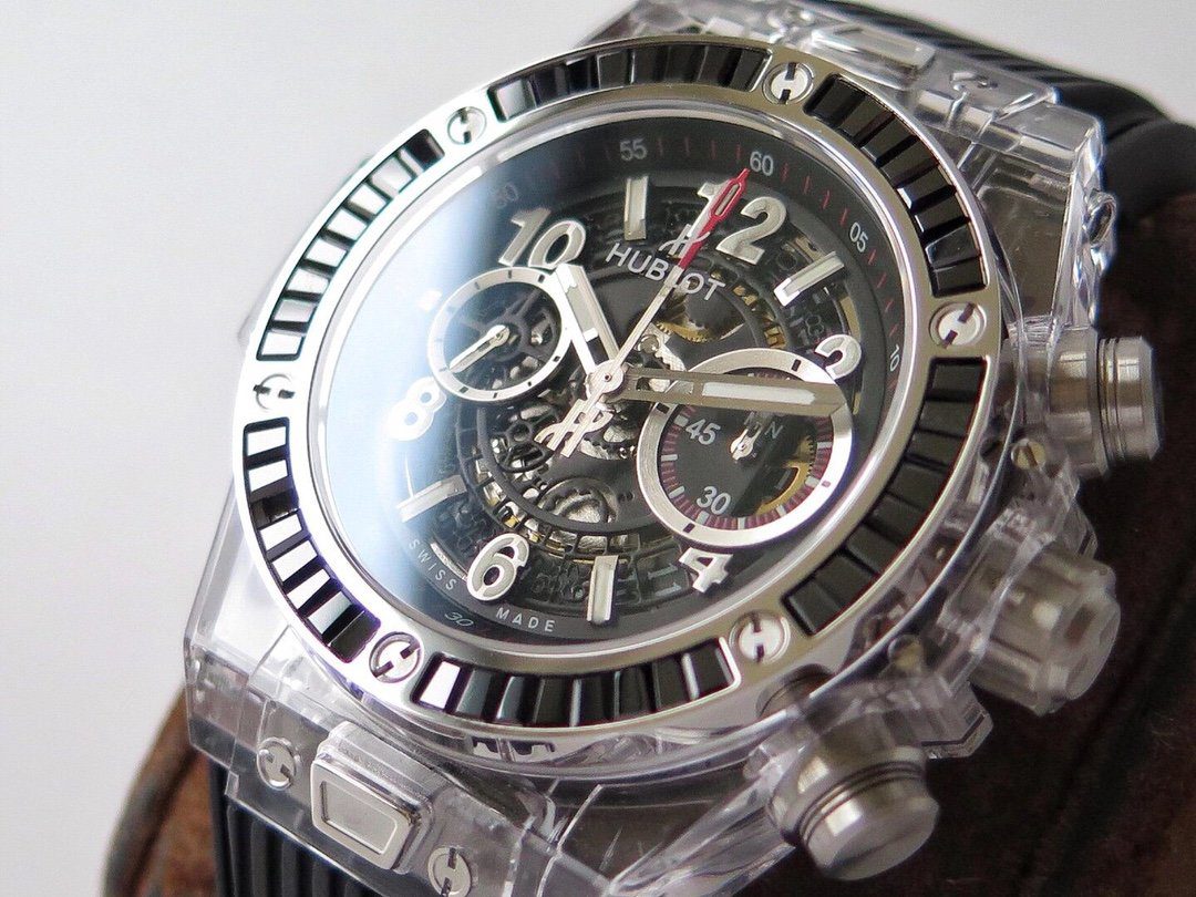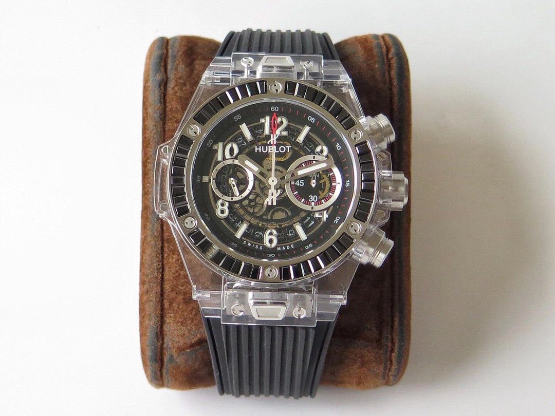 HUBLOT BIG BANG UNICO IMITATION WATCHES CRYSTAL CASE RHINESTONE BEZEL BAGUETTE BLACK RUBBER STRAP 45MM