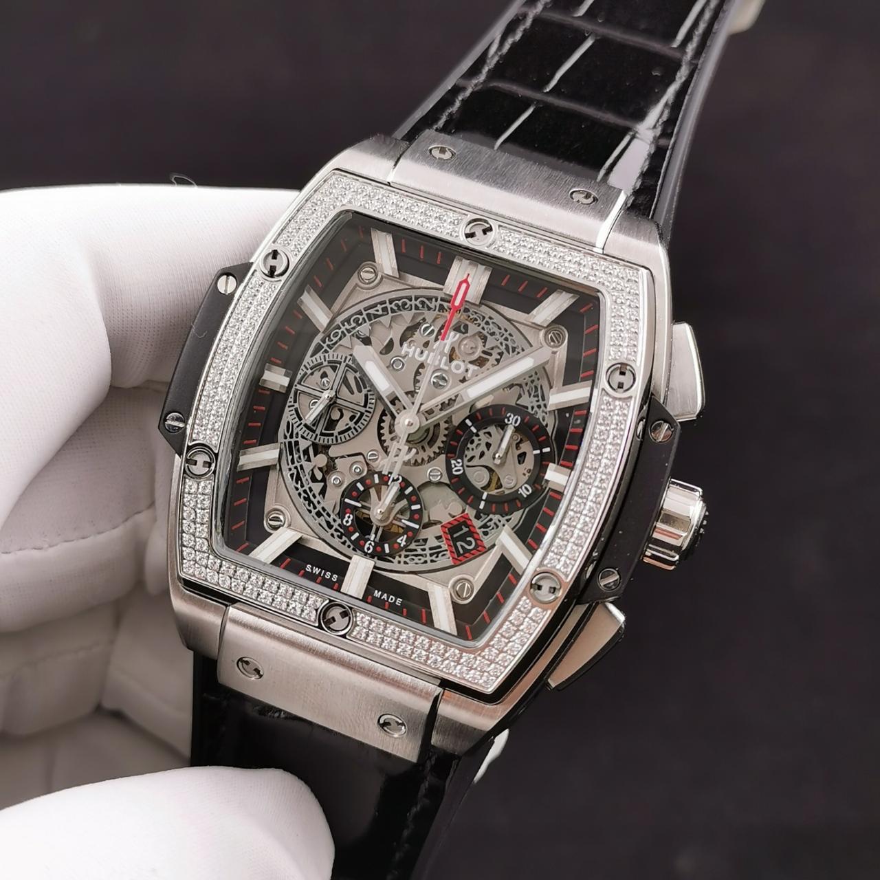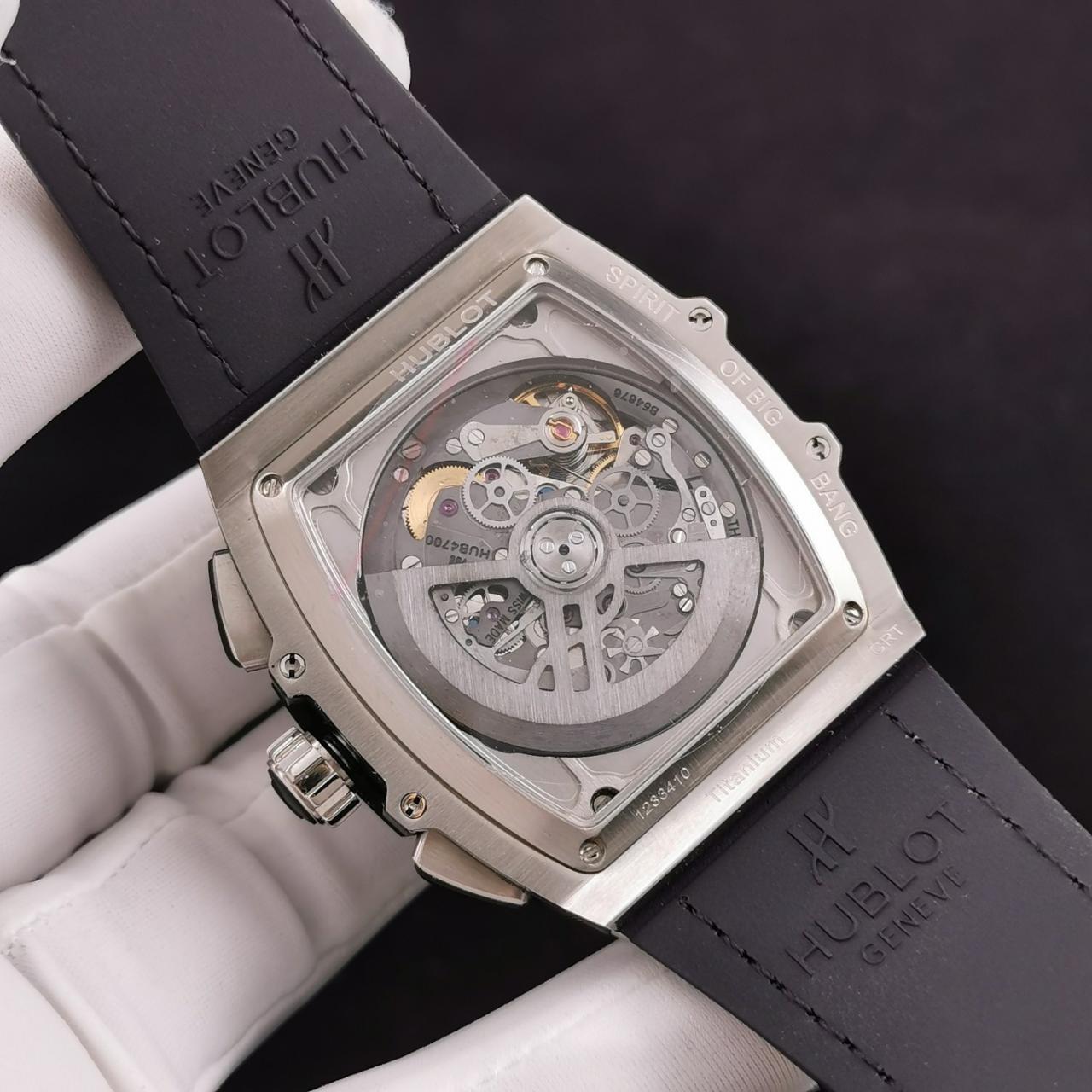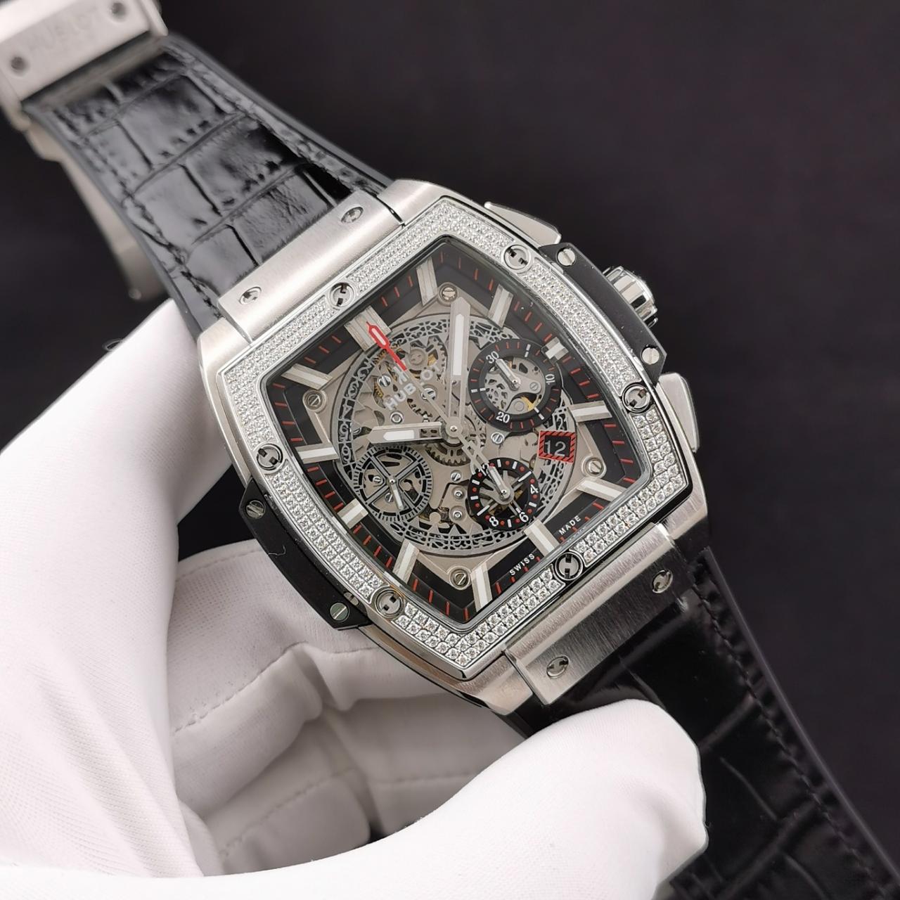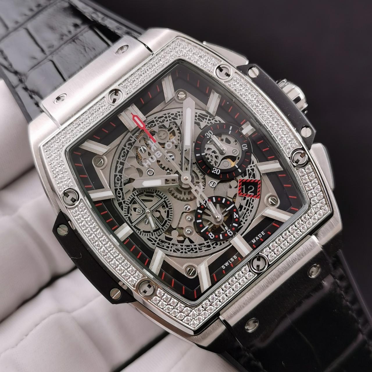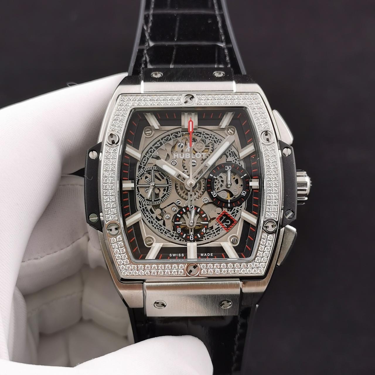 HUBLOT SPIRIT OF BIG BANG CHRONOGRAPH HIGH END WATCH REPLICAS RHINESTONE BEZEL BLACK RUBBER STRAP 42MM