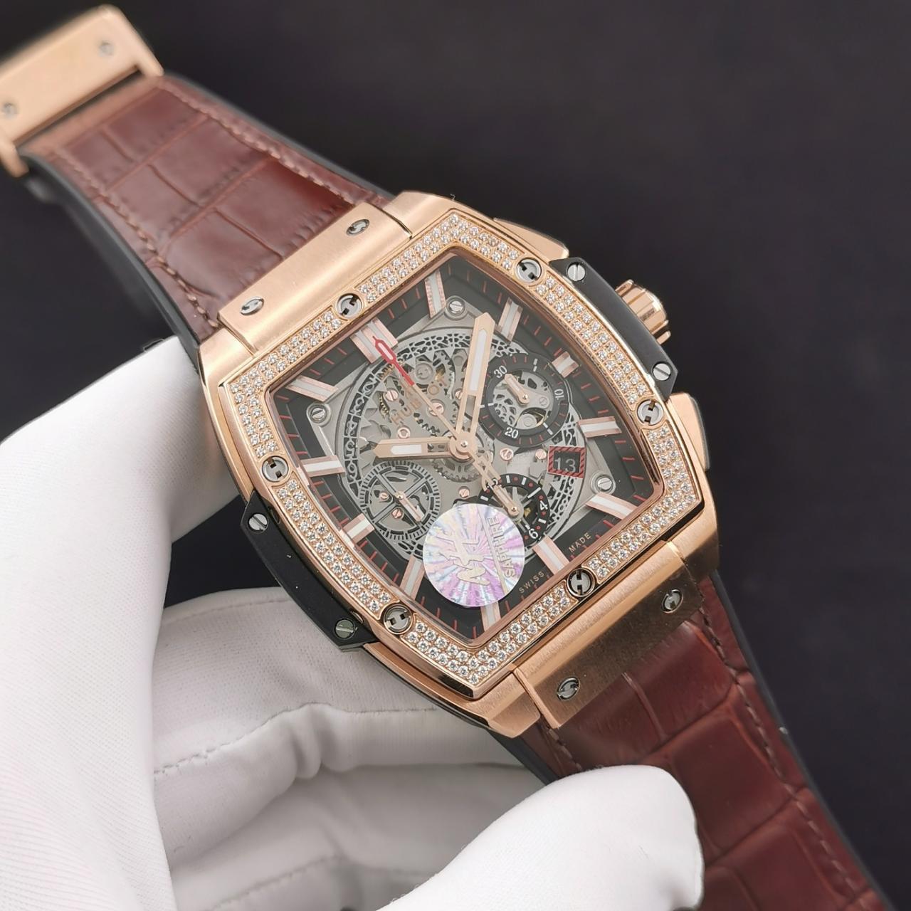 HUBLOT SPIRIT OF BIG BANG CHRONOGRAPH KING GOLD LUXURY FAKE WATCHES RHINESTONE BEZEL ROSE GOLD PLATE 42MM