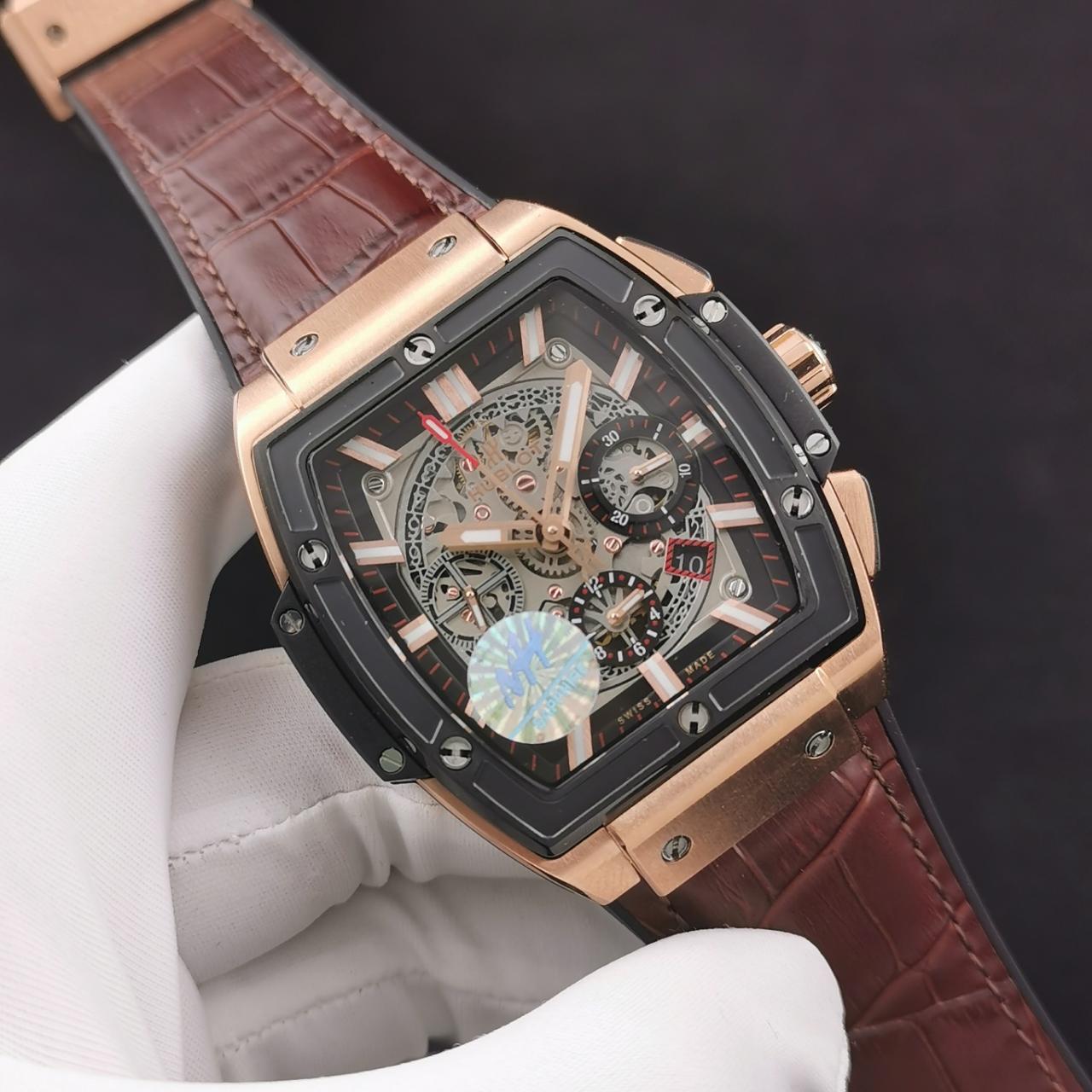 HUBLOT SPIRIT OF BIG BANG KING GOLD CHRONOGRAPH REPLICA WATCHES ROSE GOLD PLATE BROWN RUBBER STRAP 42MM