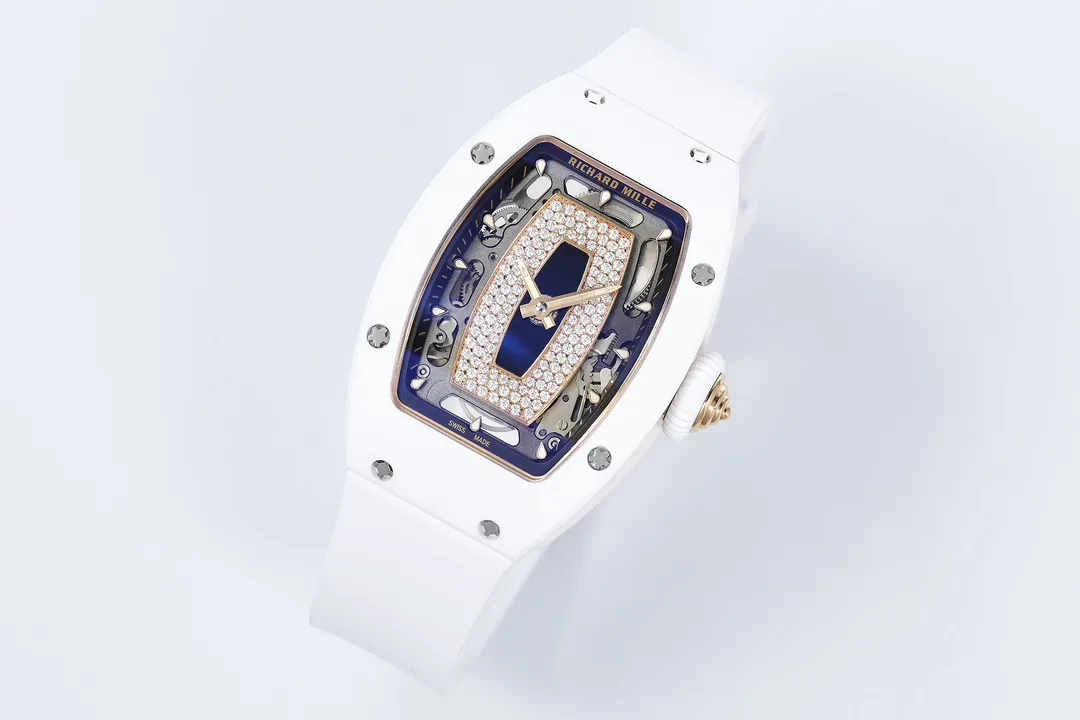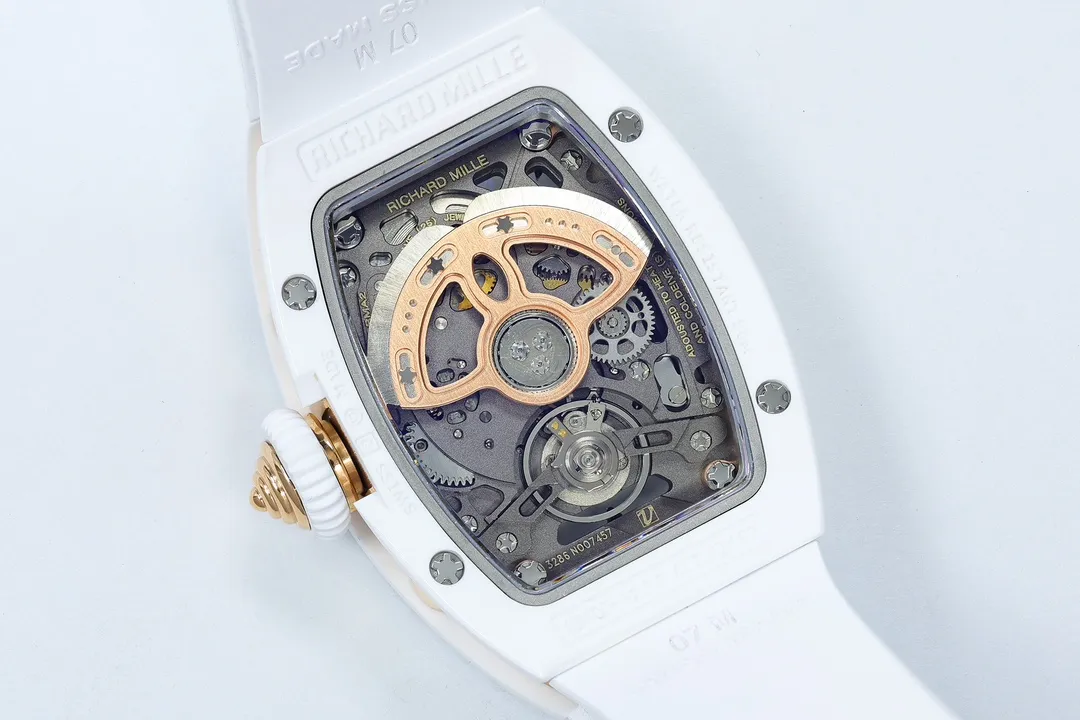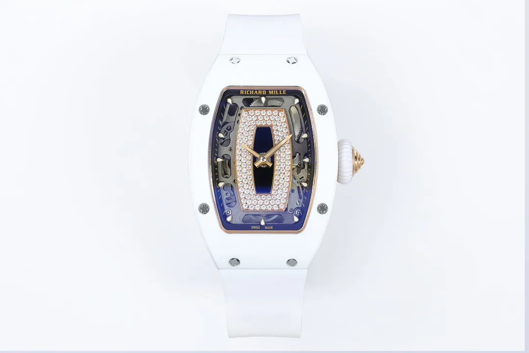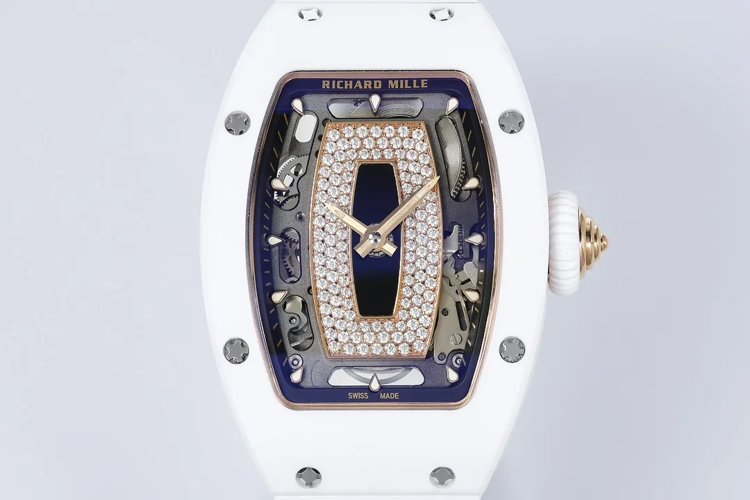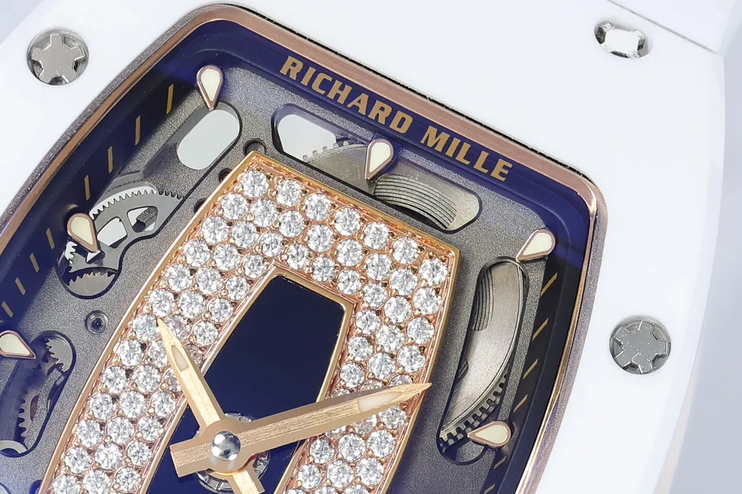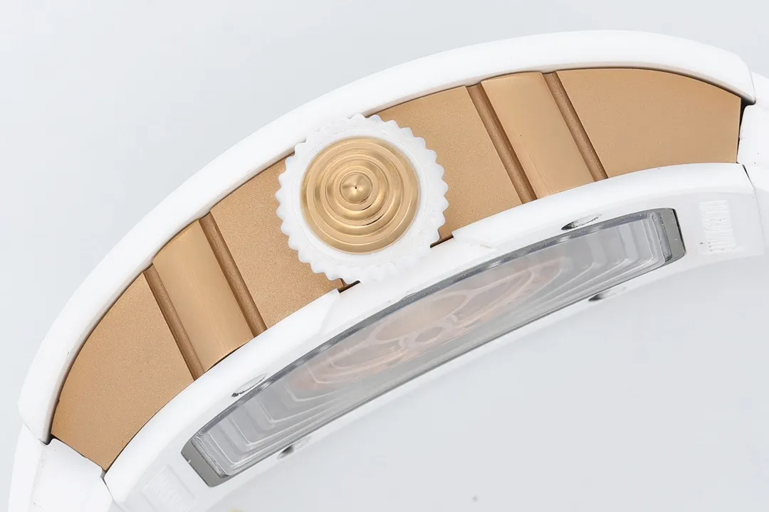 RICHARD MILLE RM07-01 KNOCK OFF WATCHES WHITE CERAMIC CASE ROSE GOLD PLATE RHINESTONE DIAL ZF FACTORY 31.5MM x 12MM