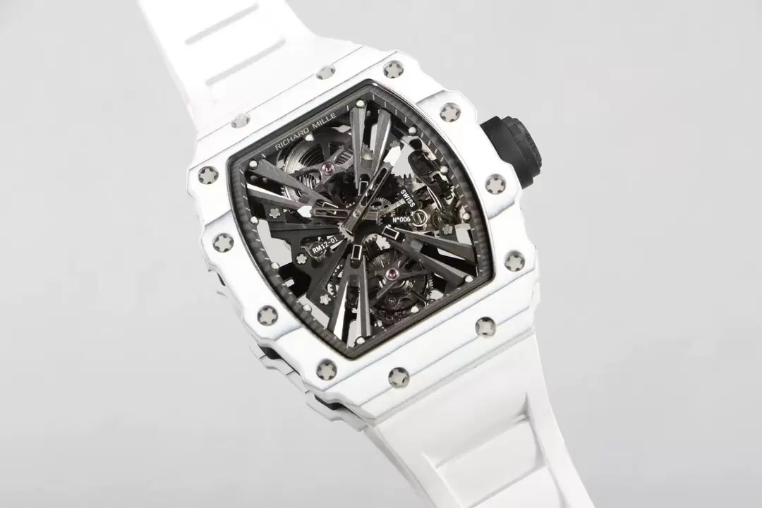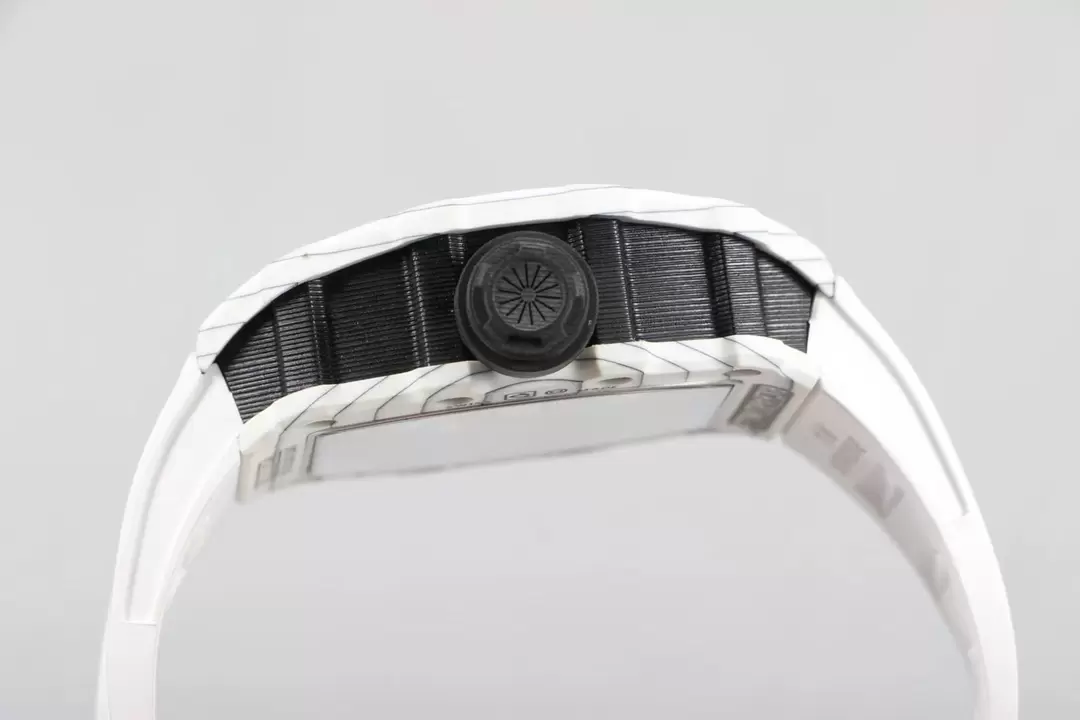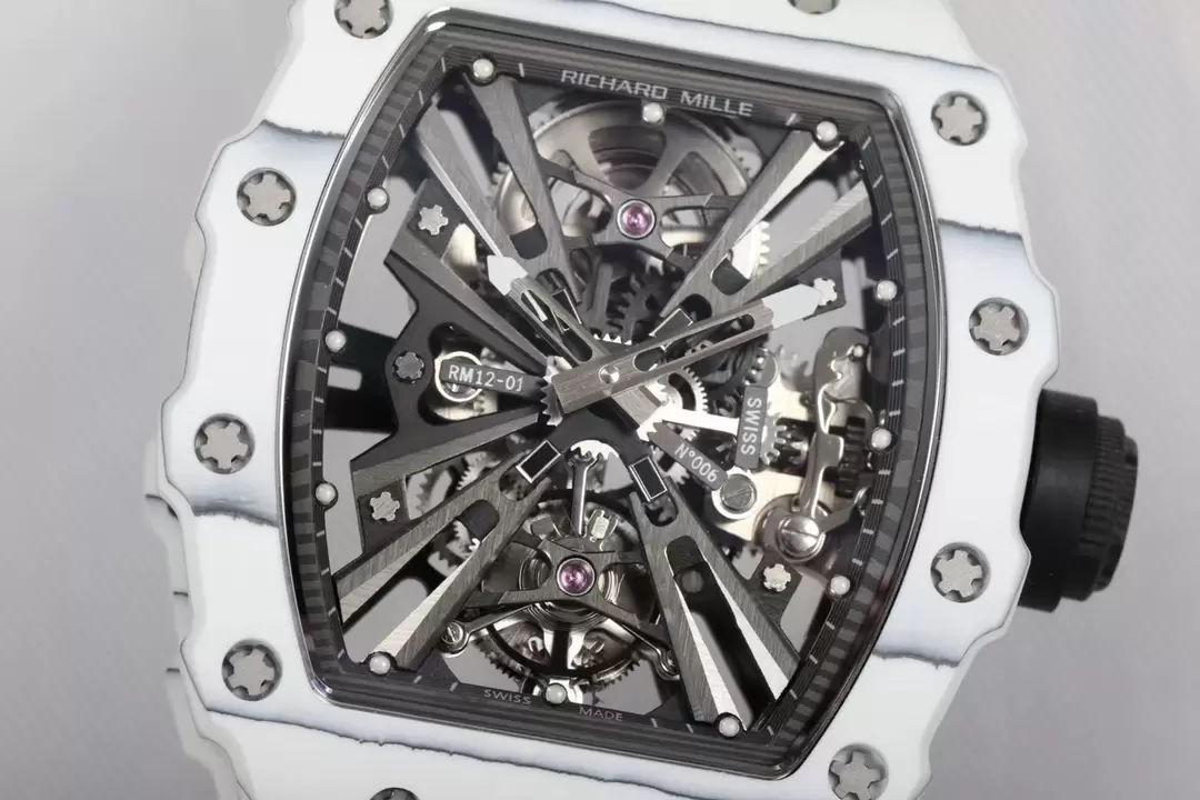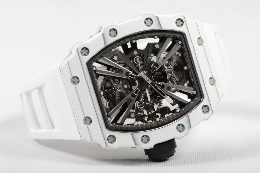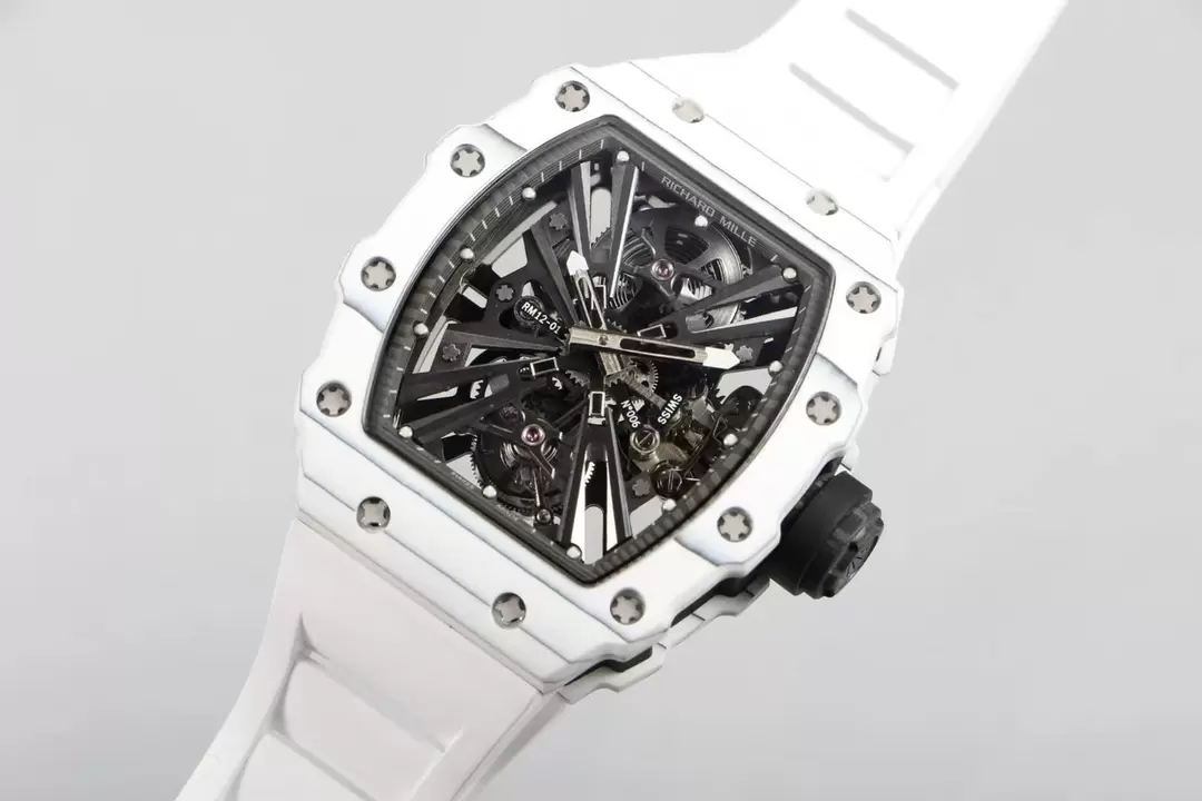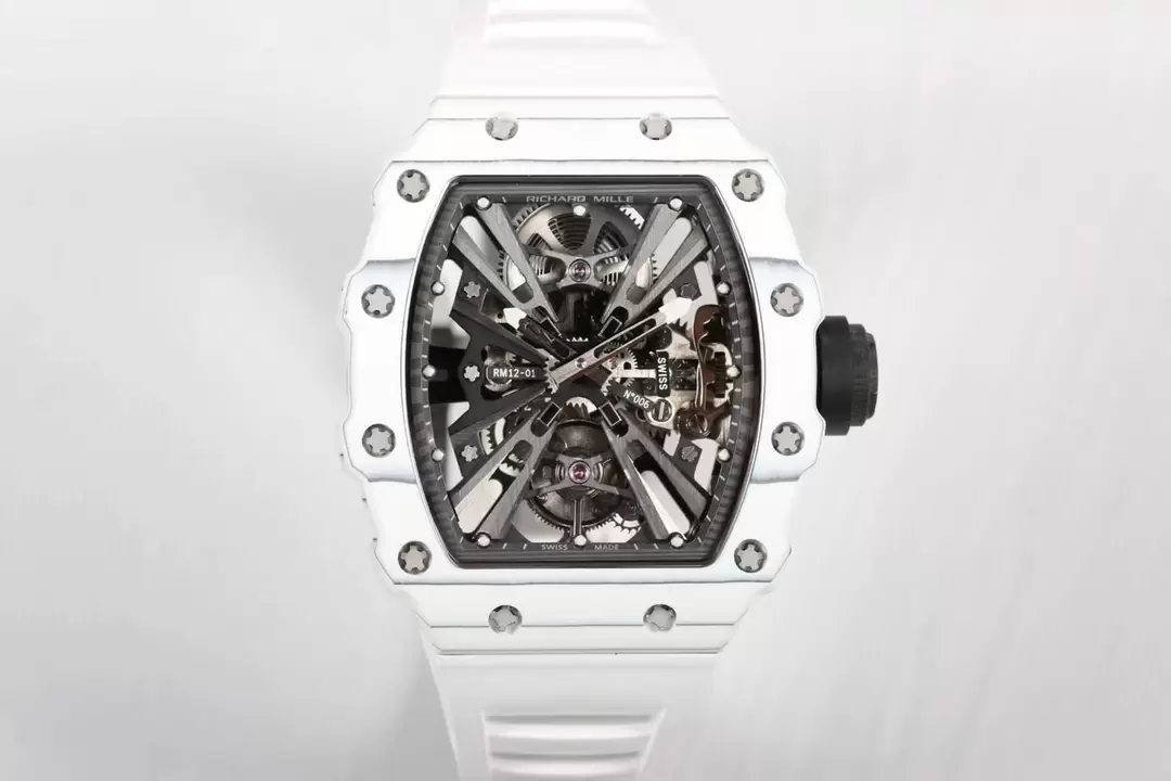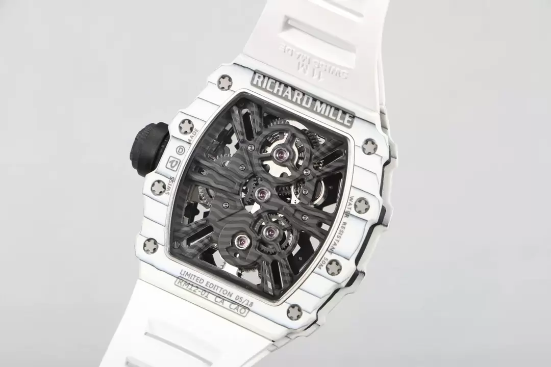 RICHARD MILLE RM12-01 TOURBILLON LUXURY FAKE WATCHES WHITE CARBON CASE RUBBER STRAP 42MM