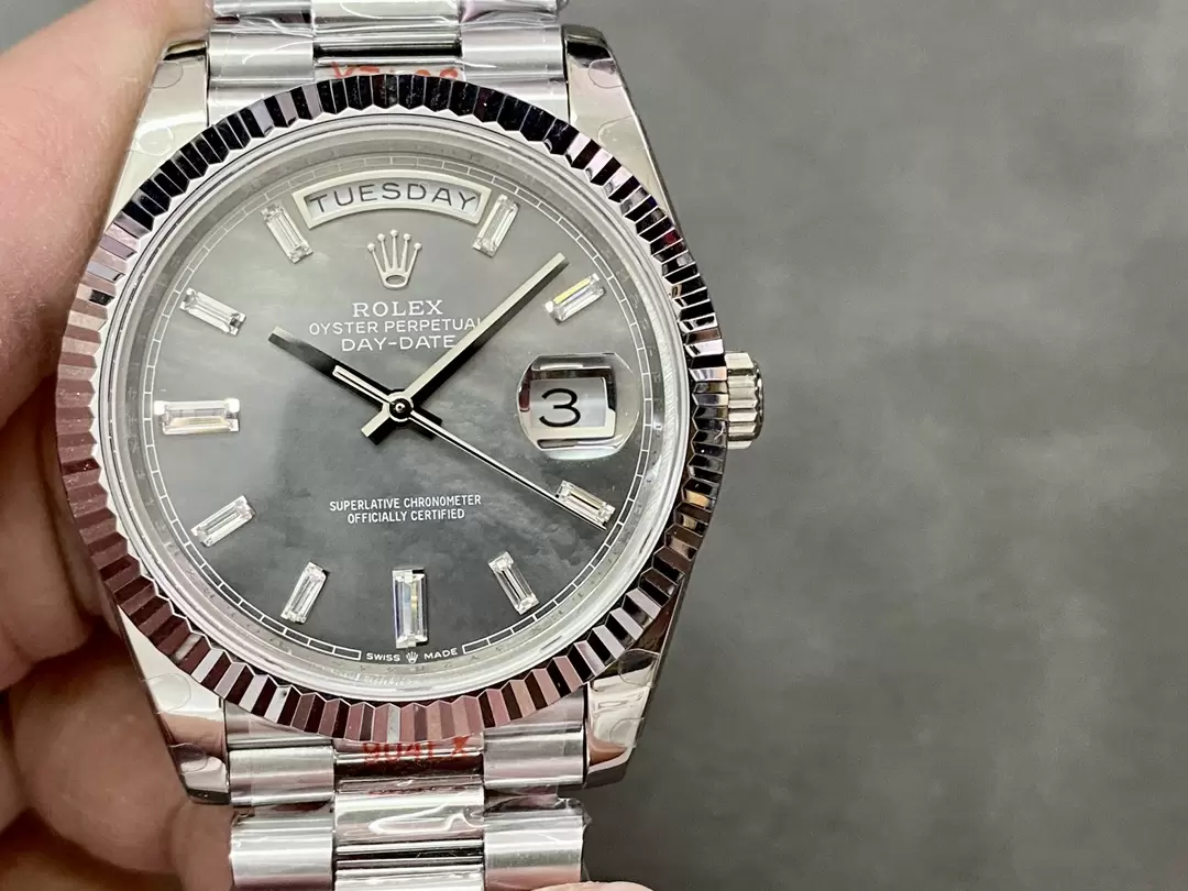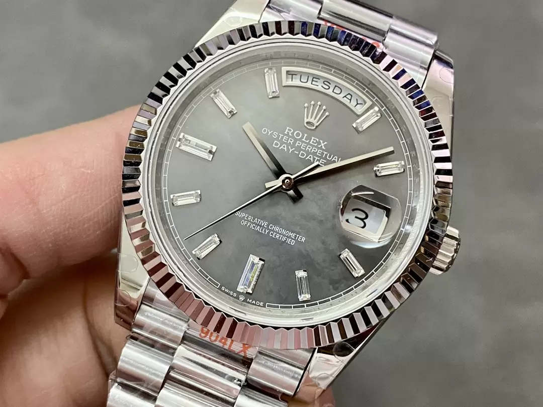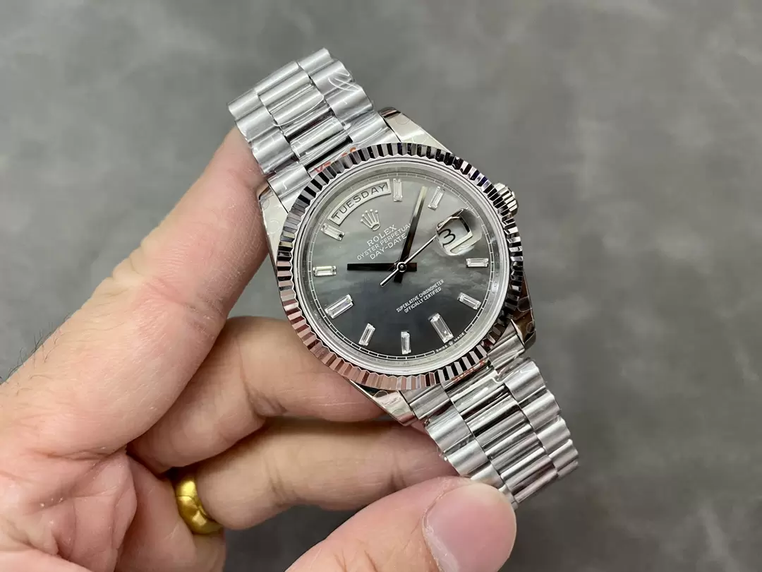 ROLEX DAY-DATE 22826 COPIES WATCHES BLACK MOTHER OF PEARL DIAL RHINESTONE BAGUETTE HOURS GM FACTORY 41MM