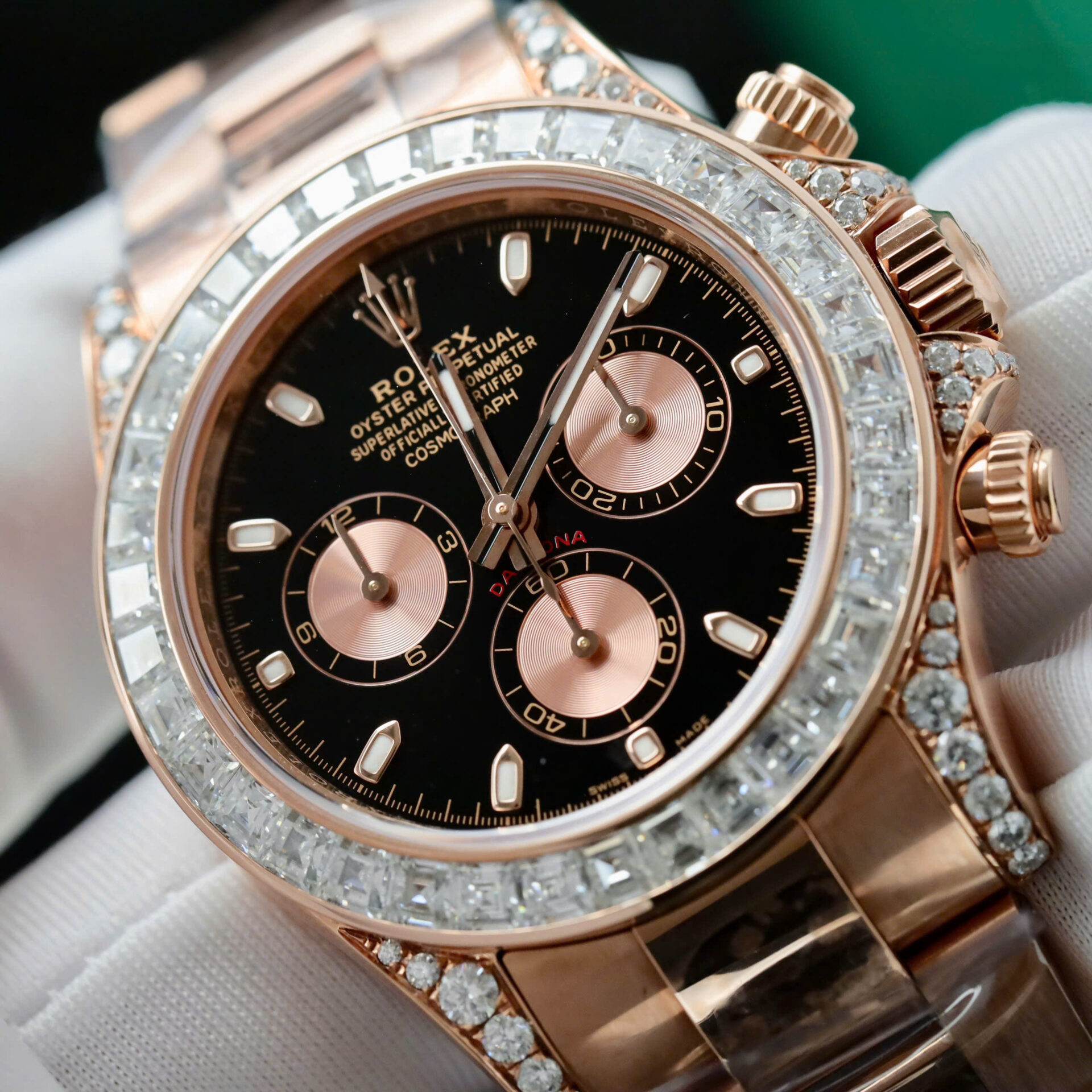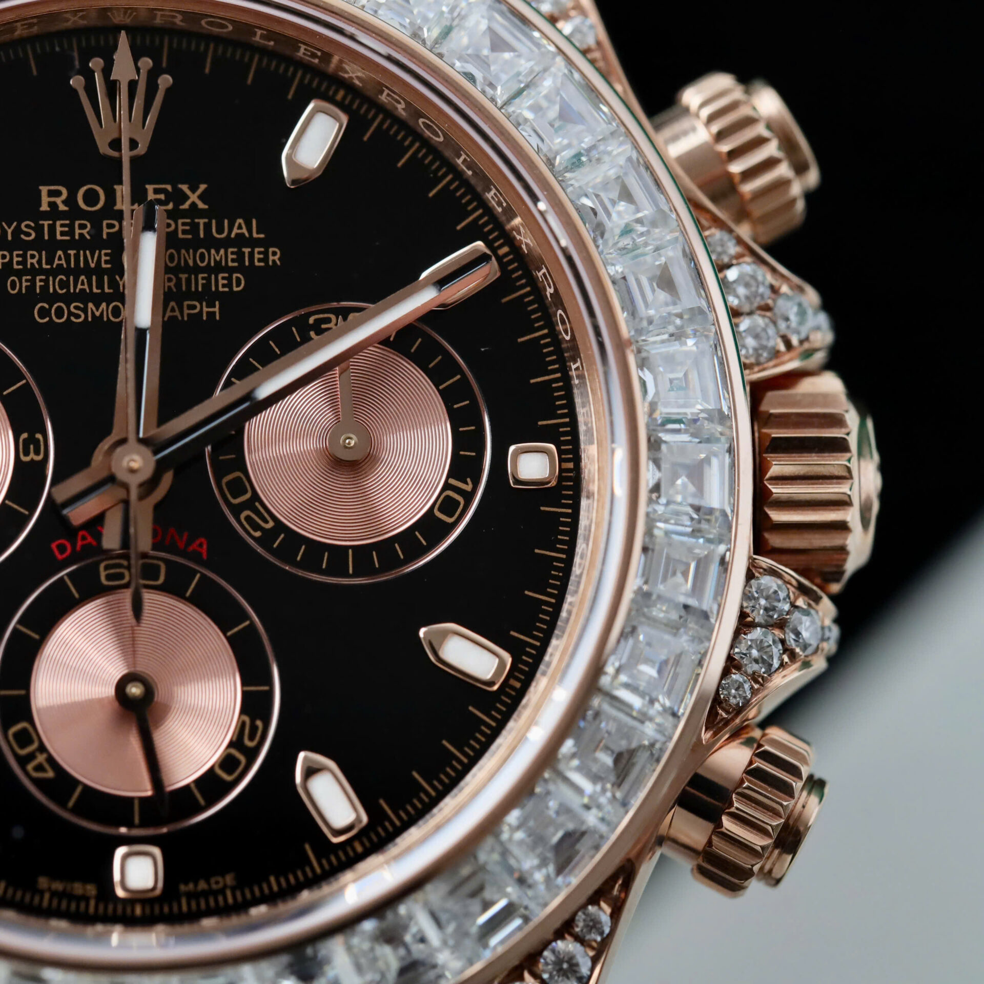 ROLEX DAYTONA BLACK DIAL ROSE WRAPPED GOLD WITH MOISSANITE CUSTOM WATCH 40MM