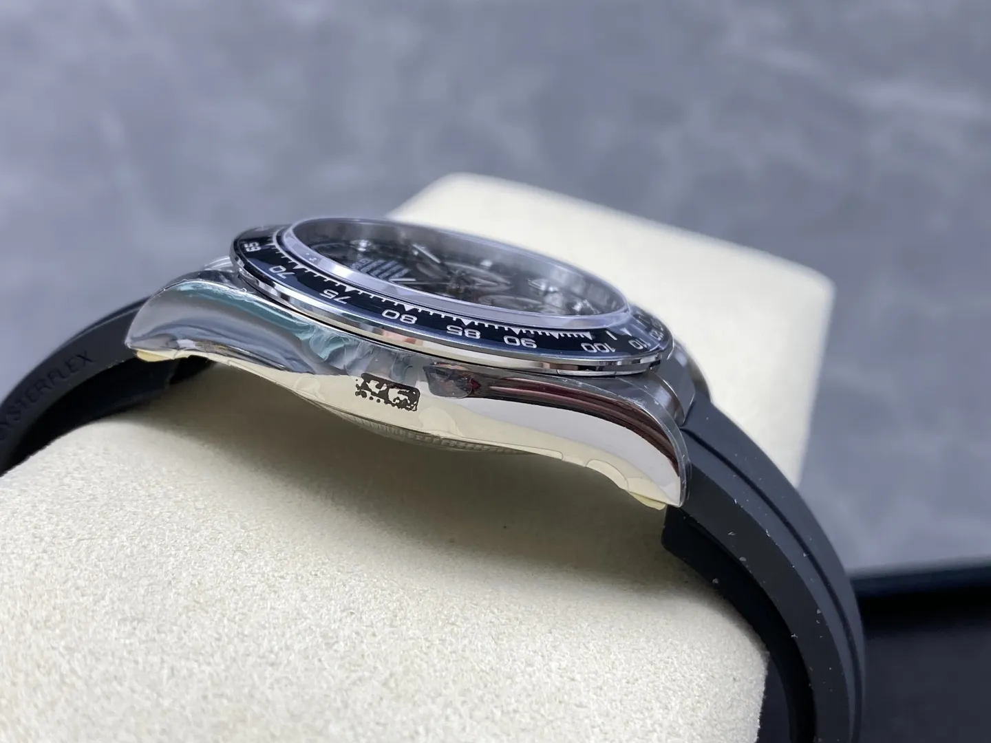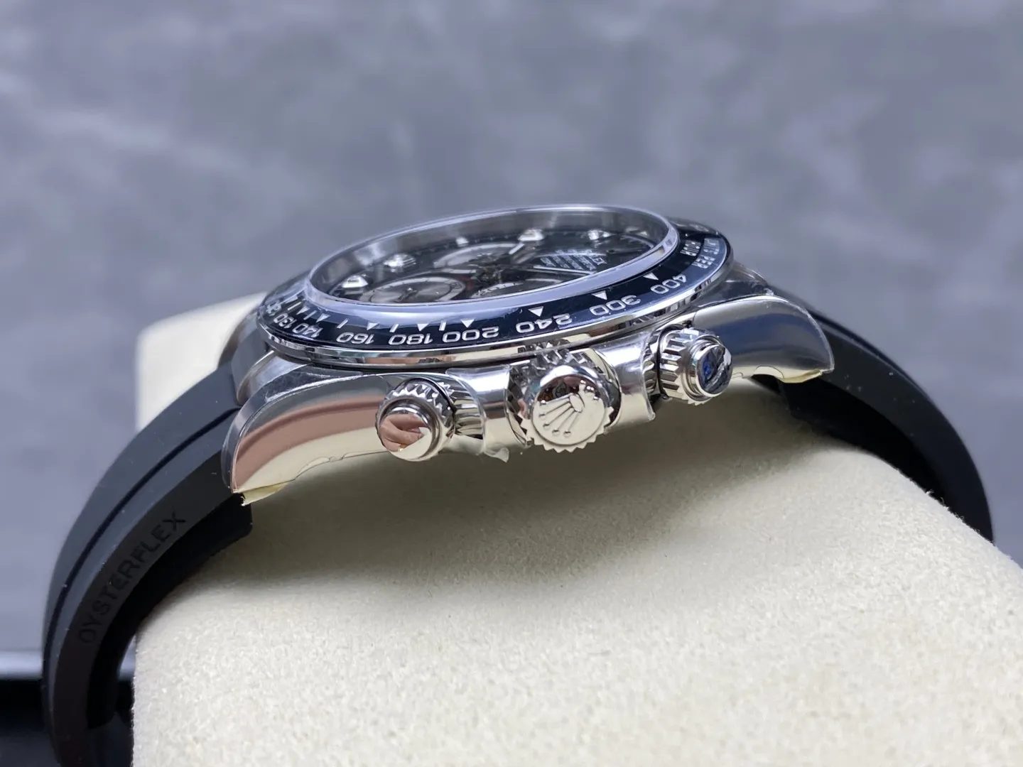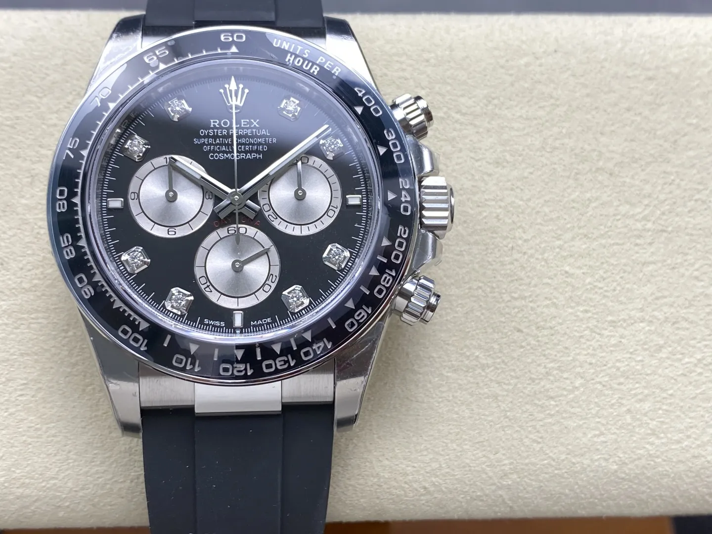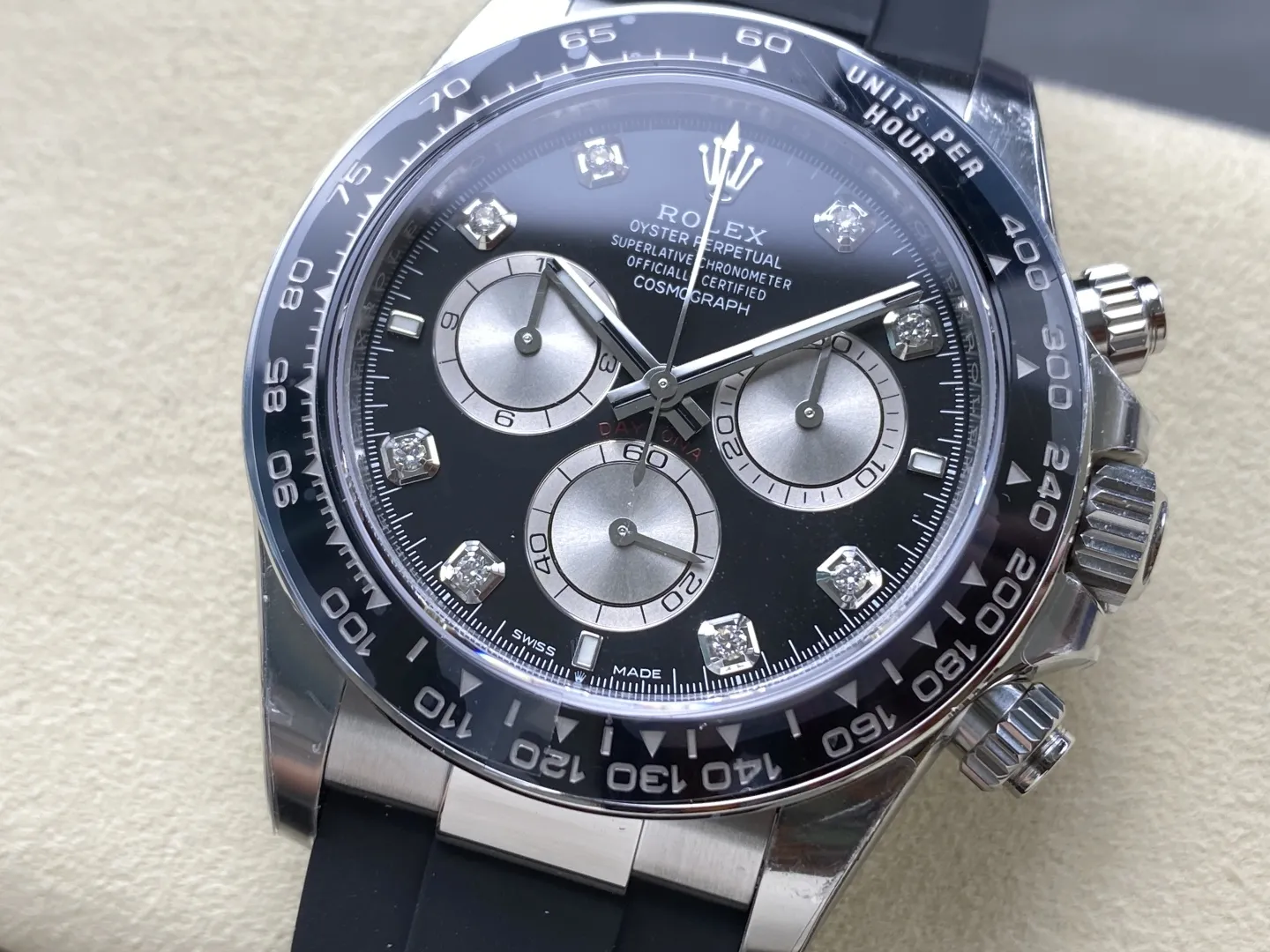 ROLEX DAYTONA COSMOGRAPH M126519LN-0004 KNOCK OFF WATCHES BLACK DIAL RHINESTONE HOURS OYSTERFLEX STRAP VS FACTORY 40MM