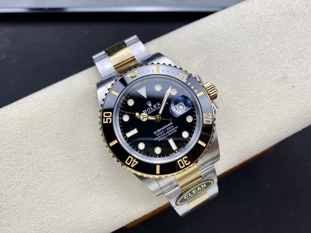 ROLEX SUBMARINER LUXURY FAKE WATCHES TWO TONE BLACK DIAL AND BEZEL GOLD PLATE CLEAN FACTORY 41MM
